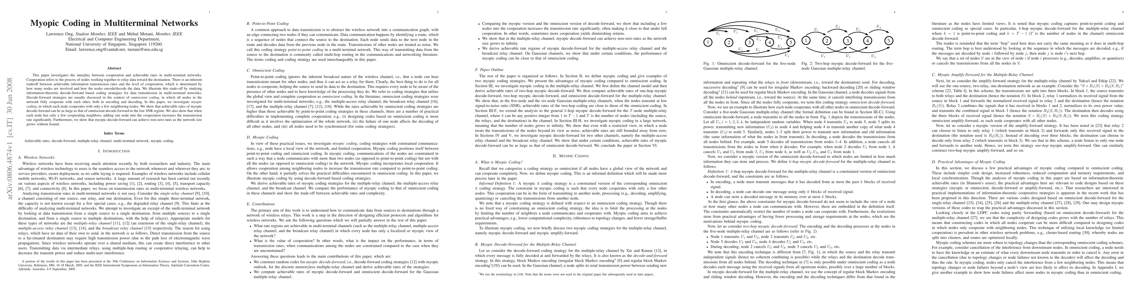 This paper investigates the interplay between cooperation and achievable rates in multi-terminal networks. Cooperation refers to the process of nodes working together to relay data toward the destination. There is an inherent tradeoff between achievable information transmission rates and the level of cooperation, which is determined by how many nodes are involved and how the nodes encode/decode the data. We illustrate this trade-off by studying information-theoretic decode-forward based coding strategies for data transmission in multi-terminal networks. Decode-forward strategies are usually discussed in the context of omniscient coding, in which all nodes in the network fully cooperate with each other, both in encoding and decoding. In this paper, we investigate myopic coding, in which each node cooperates with only a few neighboring nodes. We show that achievable rates of myopic decode-forward can be as large as that of omniscient decode-forward in the low SNR regime. We also show that when each node has only a few cooperating neighbors, adding one node into the cooperation increases the transmission rate significantly. Furthermore, we show that myopic decode-forward can achieve non-zero rates as the network size grows without bound.