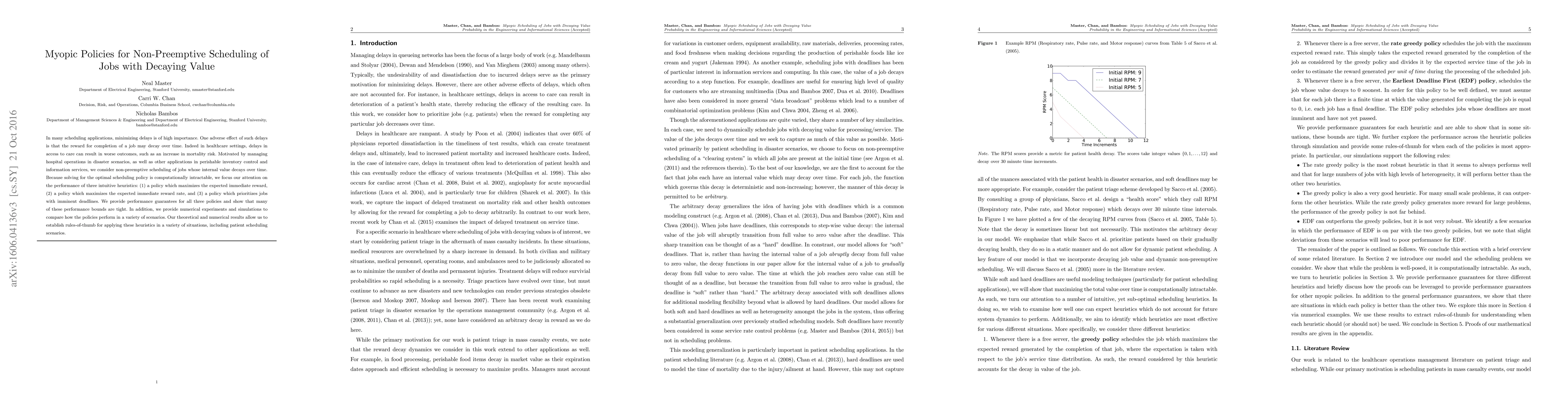 This paper examines non-preemptive job scheduling with decaying value, crucial in scenarios like disaster hospital operations and perishable inventory. It analyzes three heuristics: immediate reward maximization, immediate reward rate maximization, and deadline priority, providing performance guarantees and comparing them via simulations. The study offers guidelines for applying these heuristics in diverse contexts, including patient scheduling.