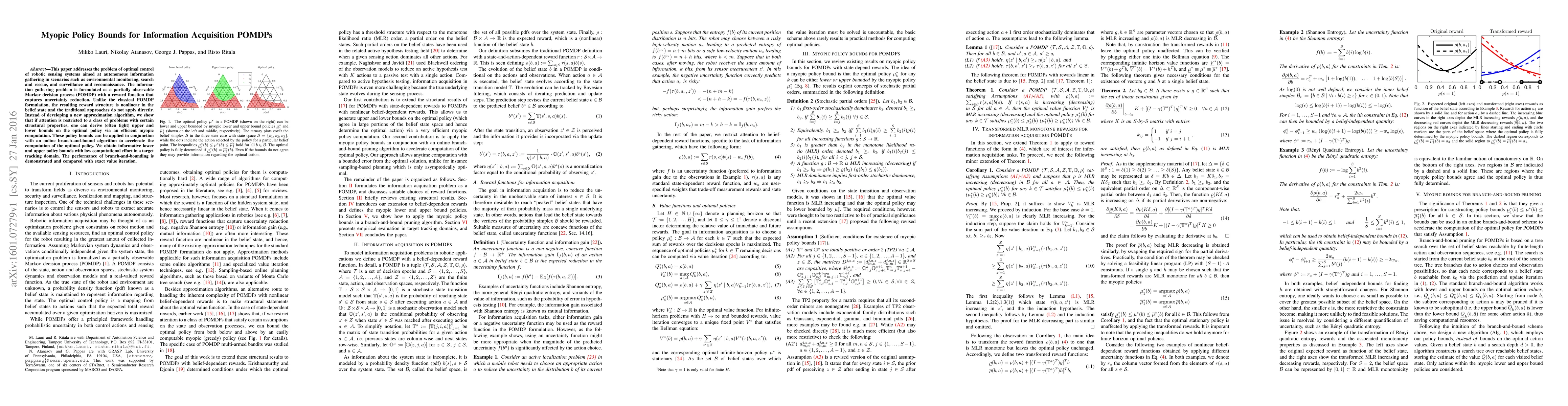 This paper develops myopic policy bounds for optimal control in information acquisition POMDPs, showing efficient computation via an online branch-and-bound algorithm. It demonstrates the effectiveness of these bounds in a target tracking domain compared to exact value iteration.