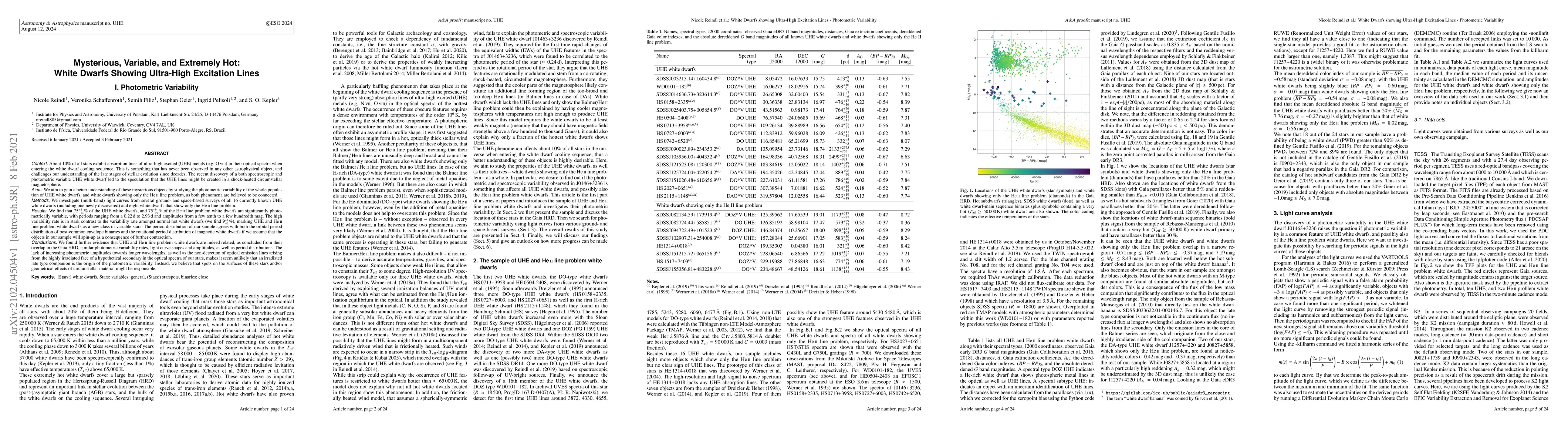 About 10% of all stars exhibit absorption lines of ultra-high excited (UHE) metals (e.g. OVIII) in their optical spectra when entering the white dwarf cooling sequence. The recent discovery of a both spectroscopic and photometric variable UHE white dwarf led to the speculation that the UHE lines might be created in a shock-heated circumstellar magnetosphere. We investigate (multi-band) light curves from several ground- and space-based surveys of all 16 currently known UHE white dwarfs (including one newly discovered) and eight white dwarfs that show only the HeII line problem, as both phenomena are believed to be connected. We find that $75^{+8}_{-13}$% of the UHE white dwarfs, and $75^{+9}_{-19}$% of the HeII line problem white dwarfs are significantly photometrically variable, with periods ranging from 0.22d to 2.93d and amplitudes from a few tenth to a few hundredth mag. The high variability rate is in stark contrast to the variability rate amongst normal hot white dwarfs (we find $9^{+4}_{-2}$%), marking UHE and HeII line problem white dwarfs as a new class of variable stars. The period distribution of our sample agrees with both the orbital period distribution of post-common envelope binaries and the rotational period distribution of magnetic white dwarfs if we assume that the objects in our sample will spin-up as a consequence of further contraction. The lack of increasing photometric amplitudes towards longer wavelengths, as well as the non-detection of optical emission lines arising from the highly irradiated face of a hypothetical secondary in the optical spectra of our stars, makes it seem unlikely that an irradiated late type companion is the origin of the photometric variability. Instead, we believe that spots on the surfaces of these stars and/or geometrical effects of circumstellar material might be responsible. (abridged)