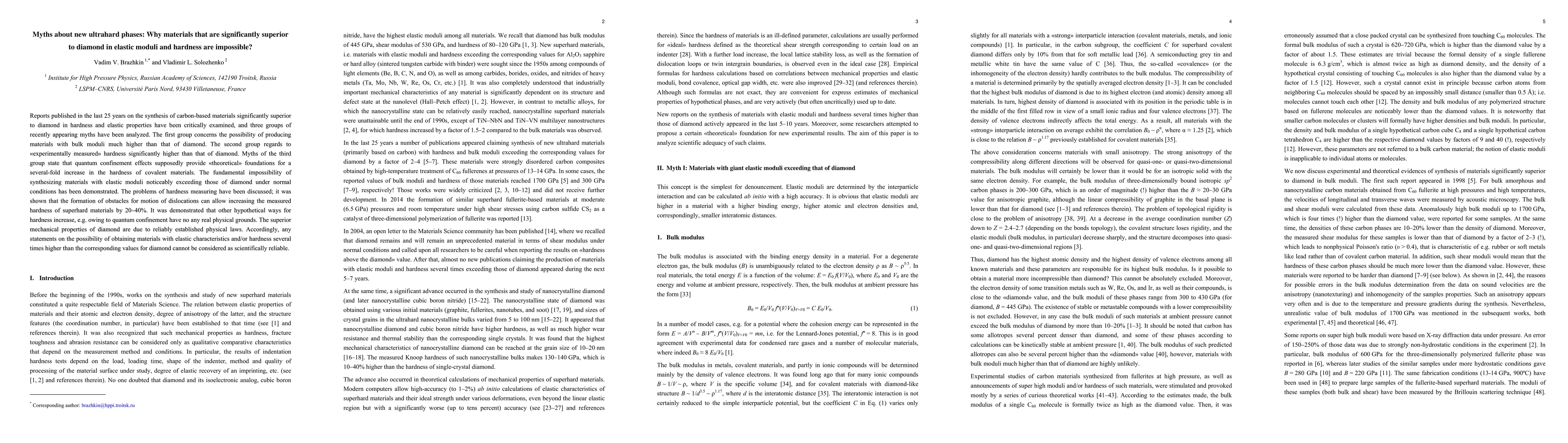 This paper critically examines myths surrounding the synthesis of carbon-based materials purportedly superior to diamond in hardness and elastic properties, demonstrating that no material can exceed diamond's mechanical properties under normal conditions due to established physical laws. It also addresses issues in hardness measurement and the lack of physical basis for claims of quantum confinement-induced hardness increases.