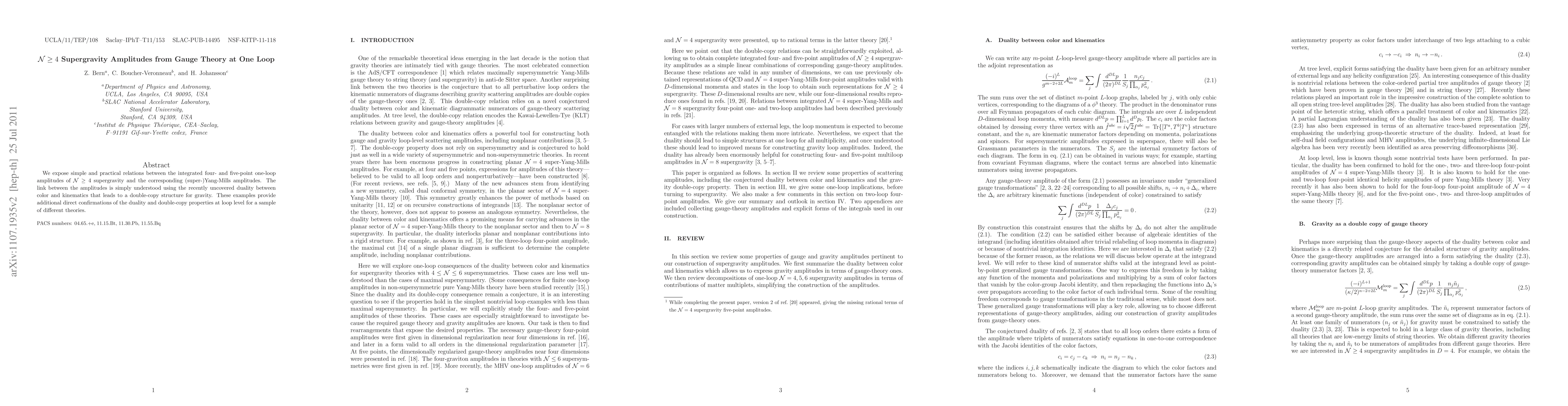 This paper establishes connections between one-loop amplitudes in N >= 4 supergravity and gauge theory through the duality between color and kinematics, confirming the double-copy structure for gravity and providing additional evidence for these properties in various theories.