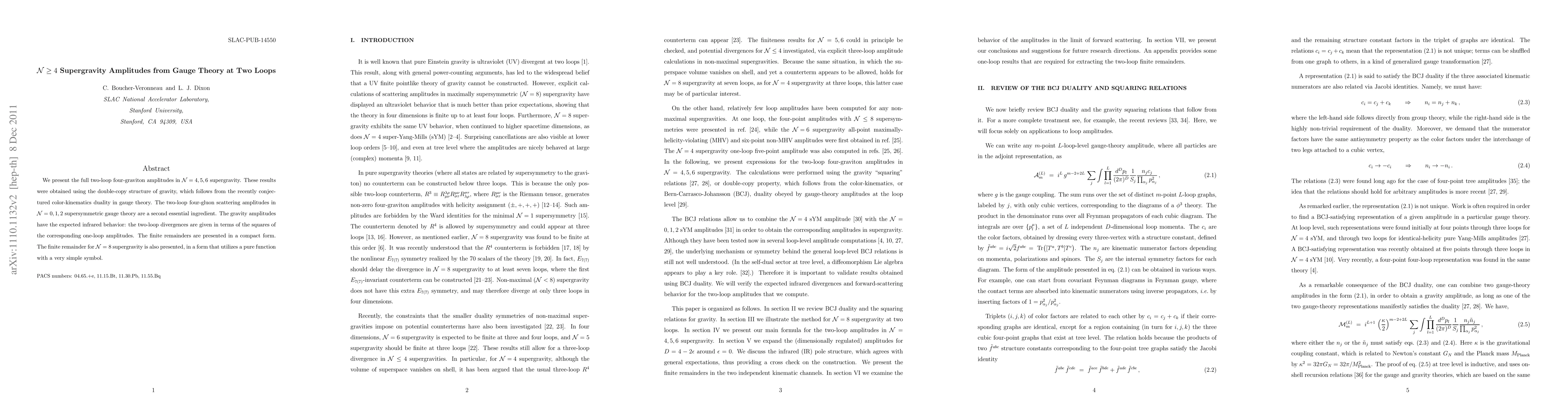 This paper calculates the full two-loop four-graviton amplitudes in N=4,5,6 supergravity using the color-kinematics duality in gauge theory, showing that the divergences match the squares of corresponding one-loop amplitudes and presenting the finite remainders in a compact form, including a simple representation for N=8 supergravity.