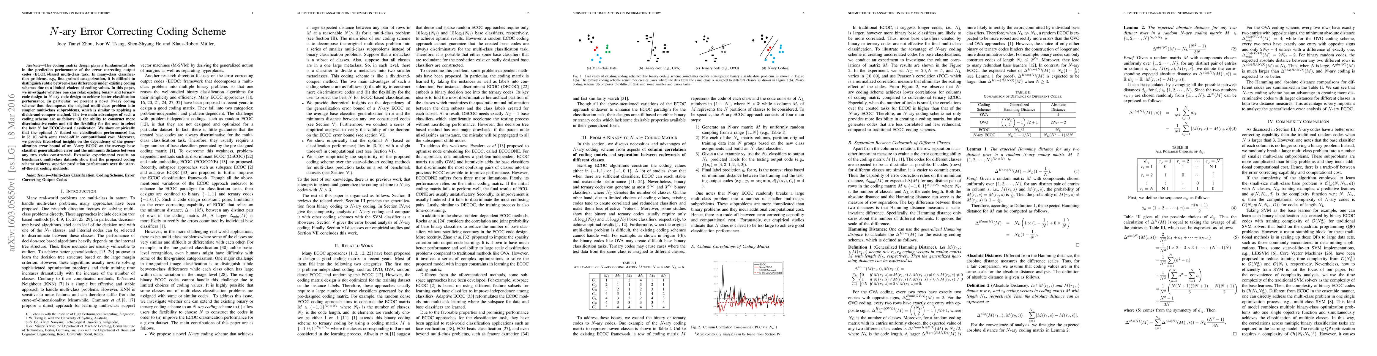 This paper proposes an innovative N-ary error correcting coding scheme for multi-class classification, which decomposes complex problems into simpler subproblems. The scheme offers more discriminative codes and flexibility in choosing the optimal N, achieving superior performance over existing methods while balancing computational costs.