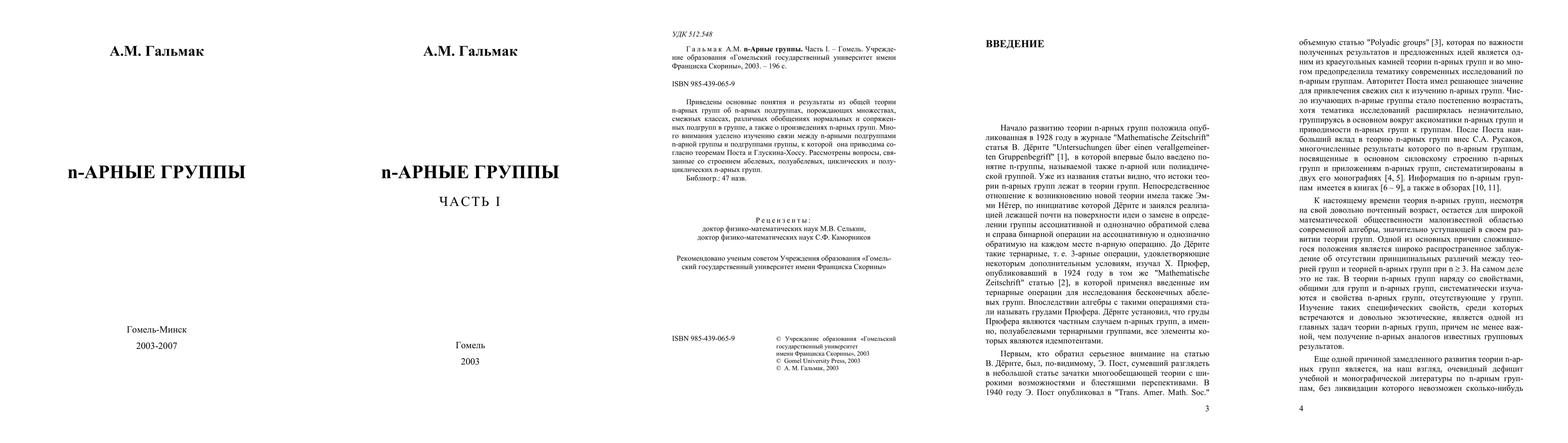 The book "N-ary Groups" (in Russian) consists of two Parts. It is intended on the one hand as an initial introduction to the theory of n-ary groups, and on the other hand it contains the published results by the author on this subject. At present, the theory of n-ary groups developing but slowly from group theory. Nonetheless, ternary and n-ary structures have recently been applied to modern models of elementary particle physics. One of the author's goals in this book is to draw the attention of mathematicians and theoretical physicists to the theory of n-ary groups, to some of its distinguishing features, and to details relevant to its further development and application. Part I: Theorems of Post and Gluskin-Hosszu. 1.1. Classical definitions of n-ary groups. Examples. 1.2. Analogies of identity and inverse elements. 1.3. Equivalent sequences. 1.4. Post's coset theorem. 1.5. Theorem of Gluskin-Hosszu. 1.6. Connection between the Post's coset theorem and theorem of Gluskin-Hosszu. Addition and comments. Part II: n-ary Analogies of Some Binary Notations. 2.1. n-ary subgroups. Cosets. 2.2 Connection between n-ary subgroups of n-ary groups. 2.3. Invariant and semiinvariant n-ary subgroups. 2.4. Conjugate and semiconjugate n-ary subgroups. 2.5. Cyclic and semicyclic n-ary groups. 2.6. Abelian n-ary groups and their generalizations. 2.7. Products of n-ary groups. 2.8. Semiabelian n-ary groups with idempotents. Addition and comments. Notations. Index. References.