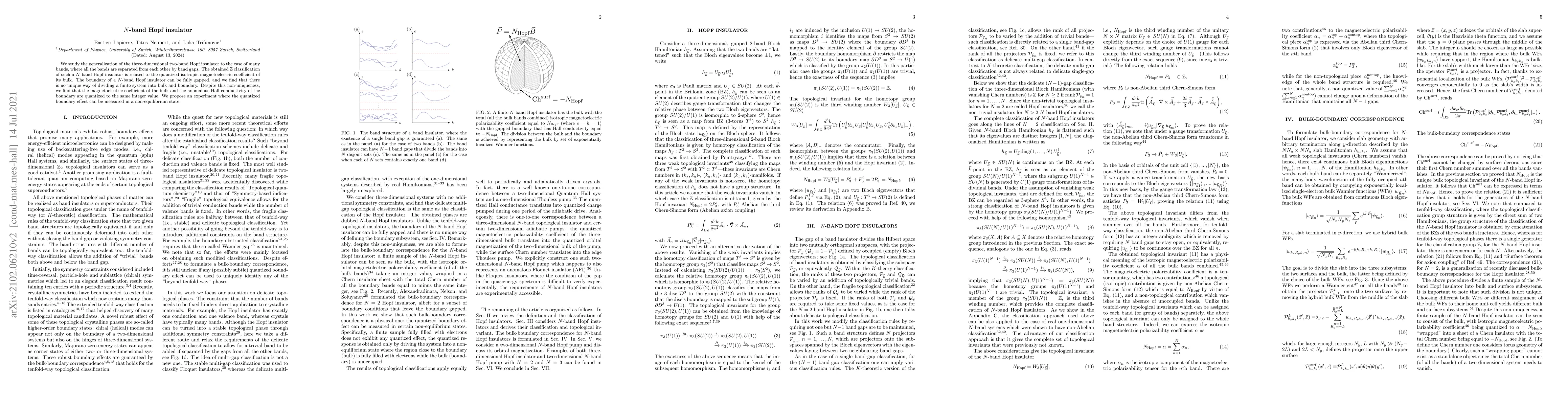 Researchers studied a new type of material called an N-band Hopf insulator, finding that it has quantized properties like magnetoelectric coefficient and anomalous Hall conductivity in its bulk and boundary regions.