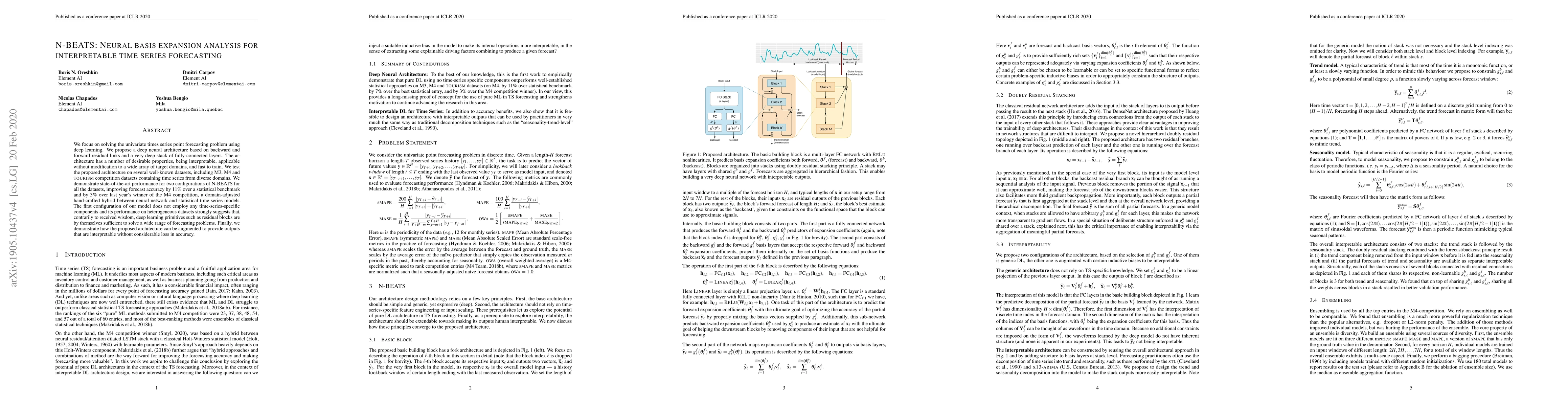 We focus on solving the univariate times series point forecasting problem using deep learning. We propose a deep neural architecture based on backward and forward residual links and a very deep stack of fully-connected layers. The architecture has a number of desirable properties, being interpretable, applicable without modification to a wide array of target domains, and fast to train. We test the proposed architecture on several well-known datasets, including M3, M4 and TOURISM competition datasets containing time series from diverse domains. We demonstrate state-of-the-art performance for two configurations of N-BEATS for all the datasets, improving forecast accuracy by 11% over a statistical benchmark and by 3% over last year's winner of the M4 competition, a domain-adjusted hand-crafted hybrid between neural network and statistical time series models. The first configuration of our model does not employ any time-series-specific components and its performance on heterogeneous datasets strongly suggests that, contrarily to received wisdom, deep learning primitives such as residual blocks are by themselves sufficient to solve a wide range of forecasting problems. Finally, we demonstrate how the proposed architecture can be augmented to provide outputs that are interpretable without considerable loss in accuracy.