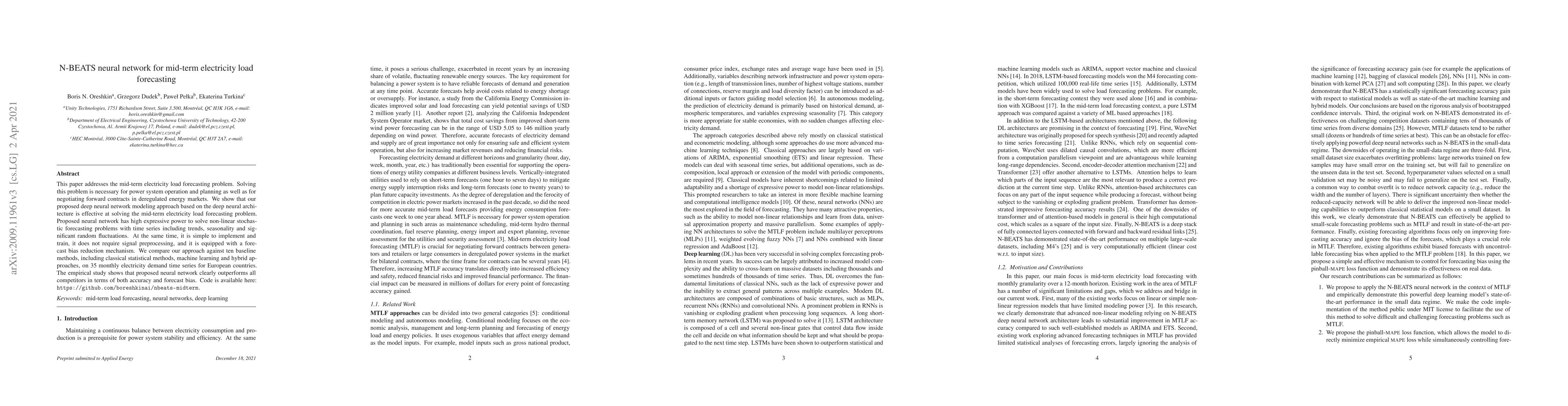 This paper proposes a deep neural network called N-BEATS for mid-term electricity load forecasting, demonstrating superior accuracy and bias reduction compared to ten baseline methods. The model is simple to implement, requires no signal preprocessing, and effectively handles time series with trends, seasonality, and random fluctuations.