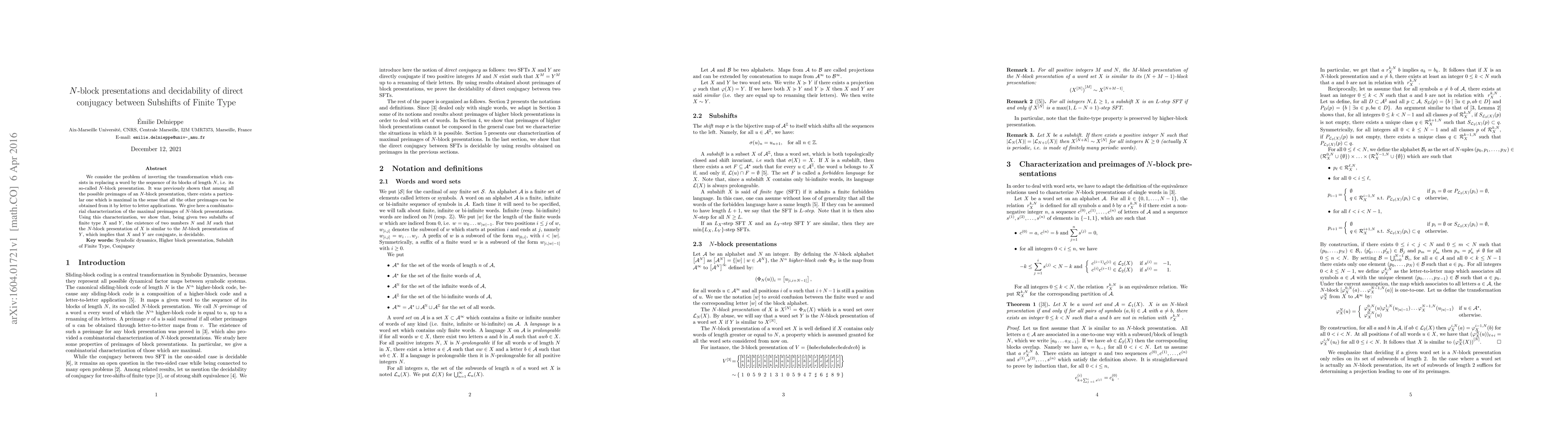 We consider the problem of inverting the transformation which consists in replacing a word by the sequence of its blocks of length N, i.e. its so-called N-block presentation. It was previously shown that among all the possible preimages of an N-block presentation, there exists a particular one which is maximal in the sense that all the other preimages can be obtained from it by letter to letter applications. We give here a combinatorial characterization of the maximal preimages of N-block presentations. Using this characterization, we show that, being given two subshifts of finite type X and Y, the existence of two numbers N and M such that the N-block presentation of X is similar to the M-block presentation of Y, which implies that X and Y are conjugate, is decidable.