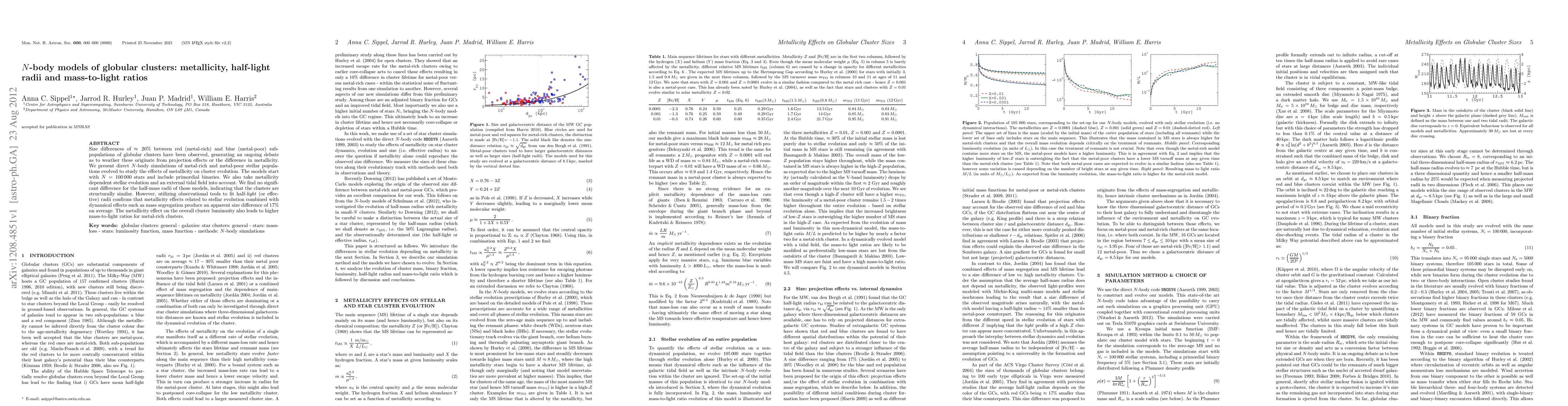 This paper uses N-body simulations to investigate the impact of metallicity on globular cluster evolution, finding no structural difference in half-mass radii but an apparent size difference of 17% due to metallicity effects and dynamical processes. Metal-rich clusters exhibit higher mass-to-light ratios.