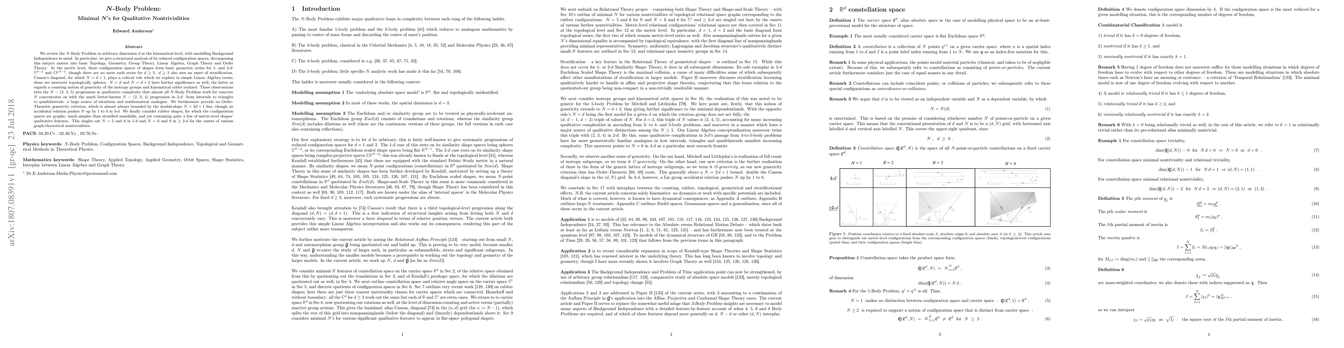 We review the $N$-Body Problem in arbitrary dimension $d$ at the kinematical level, with modelling Background Independence in mind. In particular, we give a structural analysis of its reduced configuration spaces, decomposing this subject matter into basic Topology, Geometry, Group Theory, Linear Algebra, Graph Theory and Order Theory. At the metric level, these configuration spaces of shapes form basic geometric series for 1- and 2-$d$: $\mathbb{S}^{N - 2}$ and $\mathbb{CP}^{N - 2}$, though there are no more such series for $d \geq 3$. $d \geq 3$ also sees an onset of stratification. Casson's diagonal, for which $N = d + 1$, plays a critical role which we explain in simple Linear Algebra terms; these are moreover topologically spheres. $N = d$ and $N = d + 2$ have further significance as well, the latter as regards a counting notion of genericity of the isotropy groups and kinematical orbits realized. These observations twin the $N$ = (3, 4, 5) progression in qualitative complexity that almost all $N$-Body Problem work for concrete $N$ concentrates on with the much better-known $N$ = (2, 3, 4) progression in 2-$d$: from intervals to triangles to quadrilaterals: a large source of intuitions and mathematical analogies. We furthermore provide an Order-Theoretic genericity criterion, which is almost always bounded by the double-slope $N = 2 d + 1$ line, though an accidental relation pushes $N$ up by 1 to 8 in 3-$d$. We finally consider rubber shapes, for which the configuration spaces are graphs: much simpler than stratified manifolds, and yet containing quite a few of metric-level shapes' qualitative features. This singles out $N = 5$ and 6 in 1-$d$ and $N = 6$ and 8 in $\geq$ 2-$d$ for the onsets of various graph-theoretical nontrivialities.