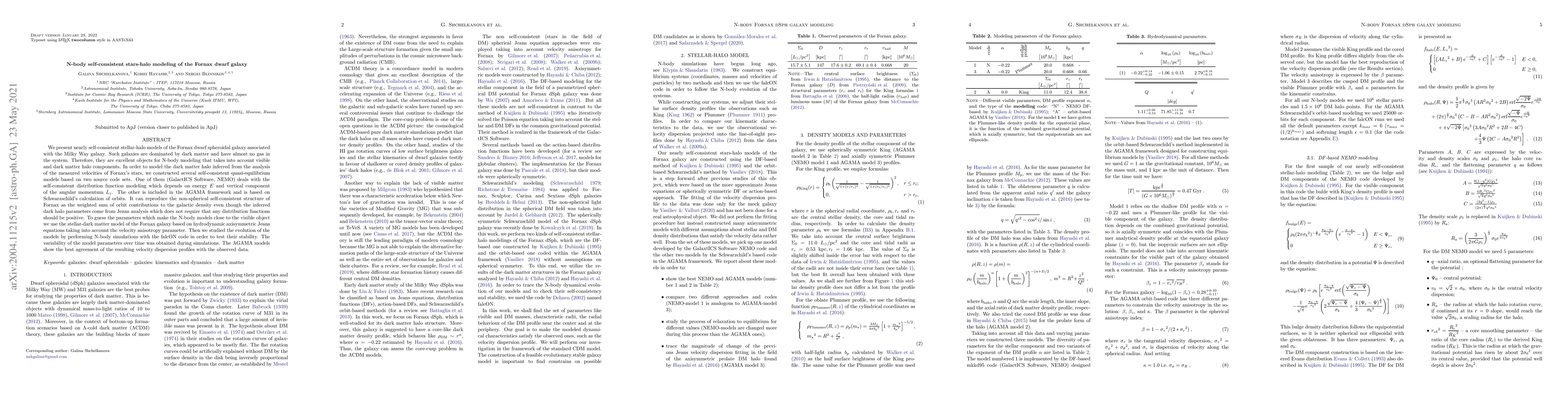 We present nearly self-consistent stellar-halo models of the Fornax dwarf spheroidal galaxy associated with the Milky Way galaxy. Such galaxies are dominated by dark matter and have almost no gas in the system. Therefore, they are excellent objects for N-body modeling that takes into account visible and dark matter halo components. In order to model the dark matter halo inferred from the analysis of the measured velocities of Fornax's stars, we constructed several self-consistent quasi-equilibrium models based on two source code sets. One of them (GalactICS Software, NEMO) deals with the self-consistent distribution function modeling which depends on energy $E$ and vertical component of the angular momentum $L_z$. The other is included in the AGAMA framework and is based on Schwarzschild's calculation of orbits. It can reproduce the non-spherical self-consistent structure of Fornax as the weighted sum of orbit contributions to the galactic density even though the inferred dark halo parameters come from Jeans analysis which does not require that any distribution functions should be positive. To guess the parameters which make the N-body models close to the visible object we use the stellar-dark matter model of the Fornax galaxy based on hydrodynamic axisymmetric Jeans equations taking into account the velocity anisotropy parameter. Then we studied the evolution of the models by performing N-body simulations with the falcON code in order to test their stability. The variability of the model parameters over time was obtained during simulations. The AGAMA models show the best agreement of the resulting velocity dispersion profiles with the observed data.