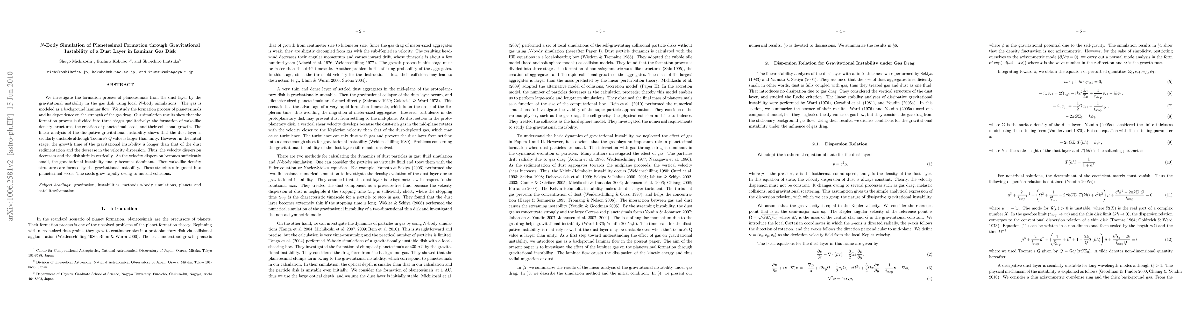 This paper explores the formation of planetesimals via gravitational instability in a laminar gas disk using local N-body simulations. The study reveals a three-stage process: initial density structure formation, seed creation, and rapid collisional growth, with the instability becoming dominant after the disk shrinks vertically.