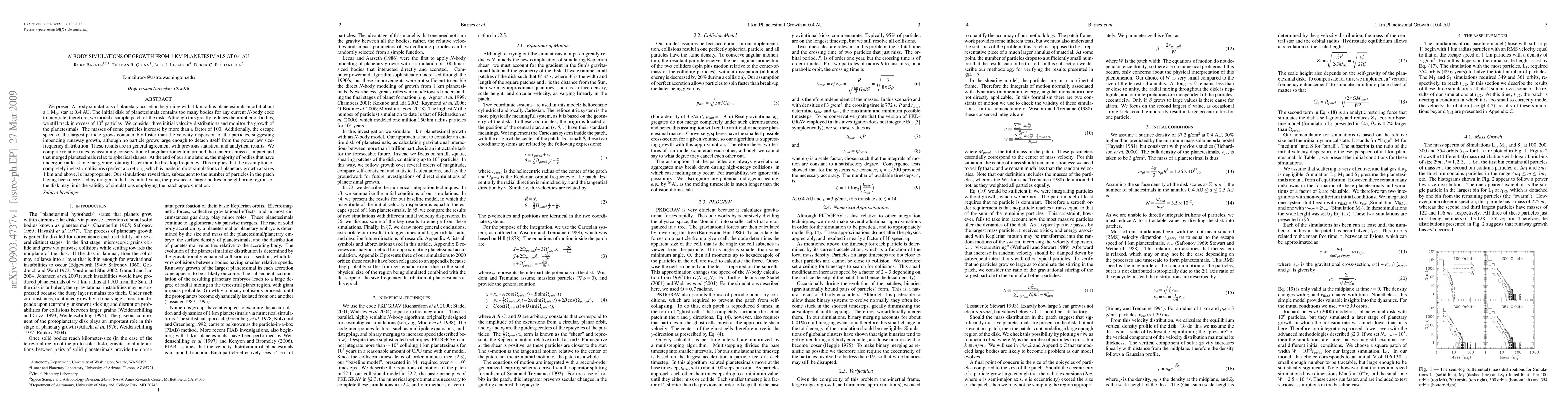 We present N-body simulations of planetary accretion beginning with 1 km radius planetesimals in orbit about a 1 solar mass star at 0.4 AU. The initial disk of planetesimals contains too many bodies for any current N-body code to integrate; therefore, we model a sample patch of the disk. Although this greatly reduces the number of bodies, we still track in excess of 10^5 particles. We consider three initial velocity distributions and monitor the growth of the planetesimals. The masses of some particles increase by more than a factor of 100. Additionally, the escape speed of the largest particle grows considerably faster than the velocity dispersion of the particles, suggesting impending runaway growth, although no particle grows large enough to detach itself from the power law size-frequency distribution. These results are in general agreement with previous statistical and analytical results. We compute rotation rates by assuming conservation of angular momentum around the center of mass at impact and that merged planetesimals relax to spherical shapes. At the end of our simulations, the majority of bodies that have undergone at least one merger are rotating faster than the breakup frequency. This implies that the assumption of completely inelastic collisions (perfect accretion), which is made in most simulations of planetary growth at sizes 1 km and above, is inappropriate. Our simulations reveal that, subsequent to the number of particles in the patch having been decreased by mergers to half its initial value, the presence of larger bodies in neighboring regions of the disk may limit the validity of simulations employing the patch approximation.