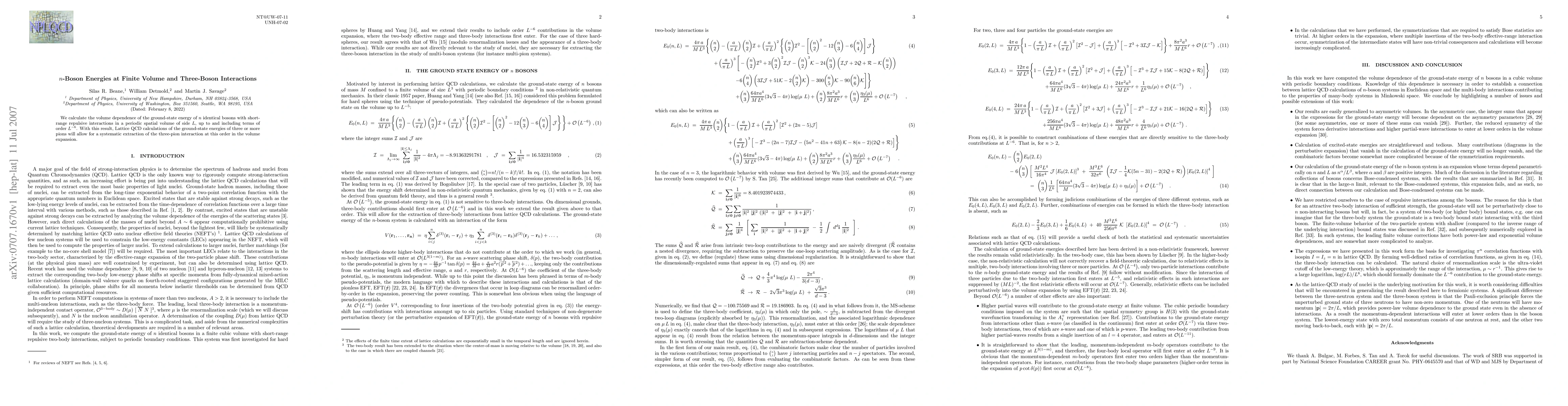 We calculate the volume dependence of the ground-state energy of n identical bosons with short-range repulsive interactions in a periodic spatial volume of side L, up to and including terms of order 1/L^6. With this result, Lattice QCD calculations of the ground-state energies of three or more pions will allow for a systematic extraction of the three-pion interaction at this order in the volume expansion.