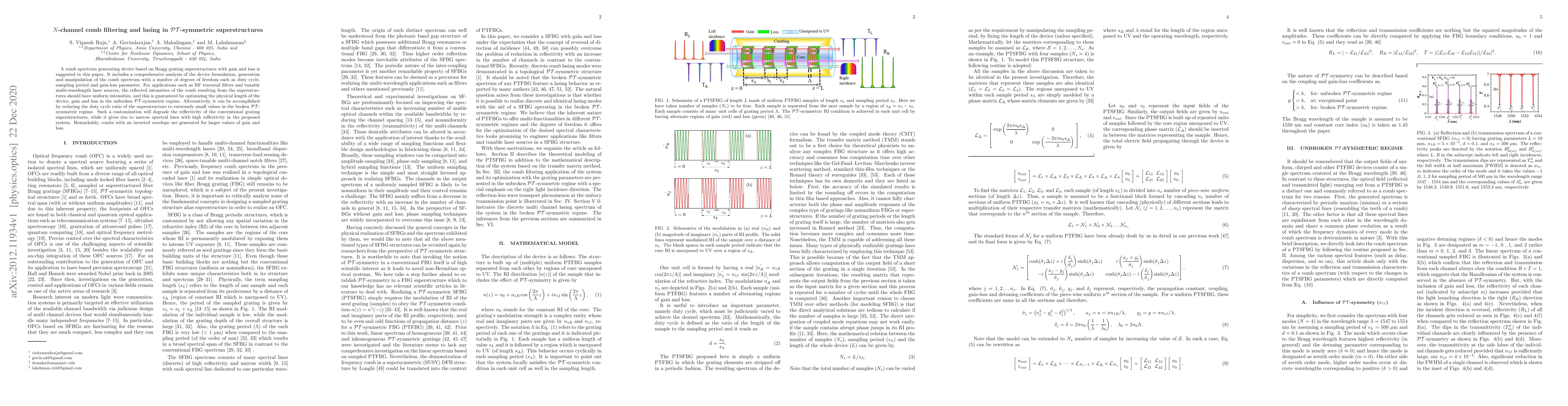 A comb spectrum generating device based on Bragg grating superstructures with gain and loss is suggested in this paper. It includes a comprehensive analysis of the device formulation, generation and manipulation of the comb spectrum with a number of degrees of freedom such as duty cycle, sampling period and gain-loss parameter. For applications such as RF traversal filters and tunable multi-wavelength laser sources, the reflected intensities of the comb resulting from the superstructures should have uniform intensities, and this is guaranteed by optimizing the physical length of the device, gain and loss in the unbroken $\mathcal{PT}$-symmetric regime. Alternatively, it can be accomplished by reducing the duty cycle ratio of the superstructure to extremely small values in the broken $\mathcal{PT}$-symmetric regime. Such a customization will degrade the reflectivity of the conventional grating superstructures, while it gives rise to narrow spectral lines with high reflectivity in the proposed system. Remarkably, combs with an inverted envelope are generated for larger values of gain and loss.