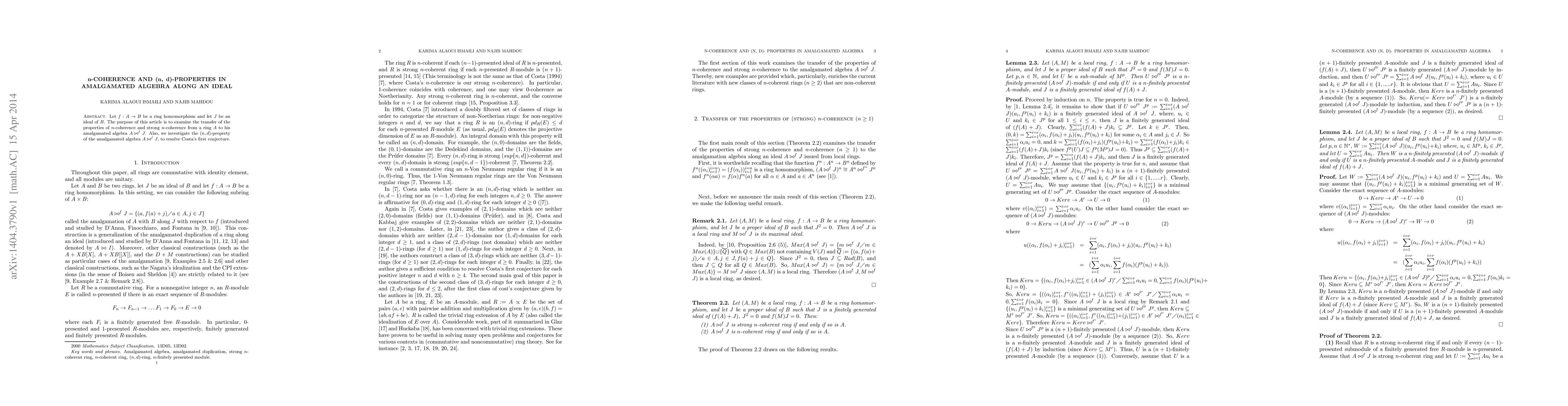 Let $f: A\rightarrow B$ be a ring homomorphism and let $J$ be an ideal of $B$. The purpose of this article is to examine the transfer of the properties of $n$-coherence and strong $n$-coherence from a ring $A$ to his amalgamated algebra $A\bowtie^{f} J$. Also, we investigate the $(n,d)$-property of the amalgamated algebra $A \bowtie^{f}J$, to resolve Costa's first conjecture.