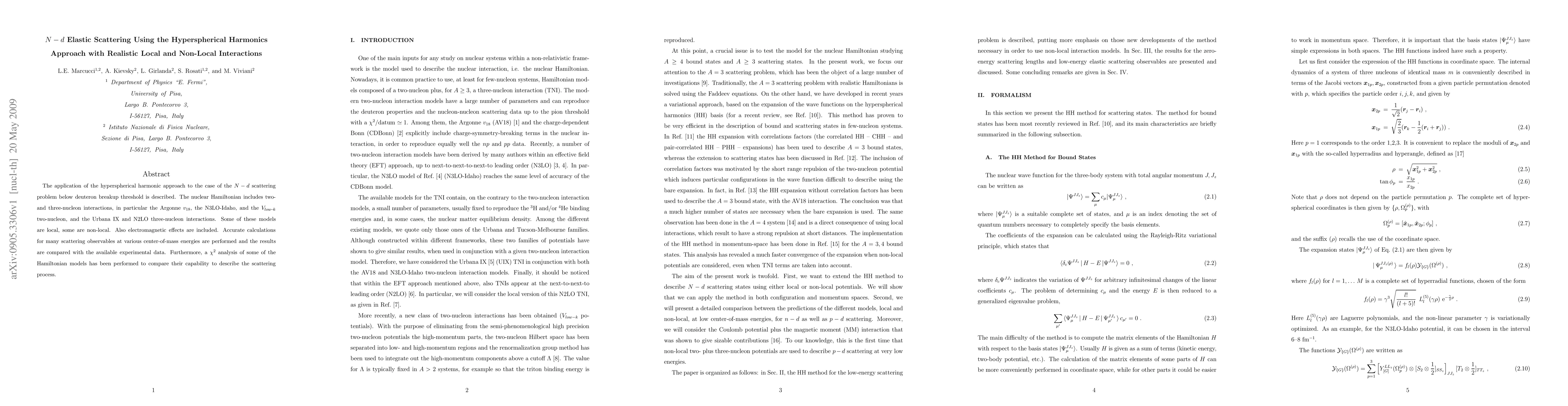 The application of the hyperspherical harmonic approach to the case of the N-d scattering problem below deuteron breakup threshold is described. The nuclear Hamiltonian includes two- and three-nucleon interactions, in particular the Argonne v_{18}, the N3LO-Idaho, and the V_{low k} two-nucleon, and the Urbana IX and N2LO three-nucleon interactions. Some of these models are local, some are non-local. Also electromagnetic effects are included. Accurate calculations for many scattering observables at various center-of-mass energies are performed and the results are compared with the available experimental data. Furthermore, a \chi^2 analysis of some of the Hamiltonian models has been performed to compare their capability to describe the scattering process.