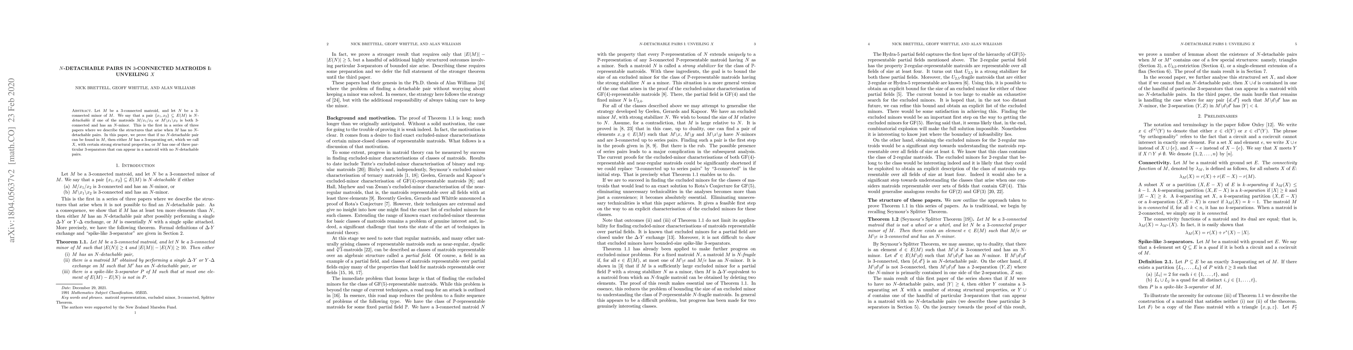 Let $M$ be a 3-connected matroid, and let $N$ be a 3-connected minor of $M$. We say that a pair $\{x_1,x_2\} \subseteq E(M)$ is $N$-detachable if one of the matroids $M/x_1/x_2$ or $M \backslash x_1 \backslash x_2$ is both 3-connected and has an $N$-minor. This is the first in a series of three papers where we describe the structures that arise when it is not possible to find an $N$-detachable pair in $M$. In this paper, we prove that if $M$ has no $N$-detachable pairs, then either $M$ has a 3-separating set, which we call $X$, with certain strong structural properties, or $M$ has one of three particular 3-separators that can appear in a matroid with no $N$-detachable pairs.