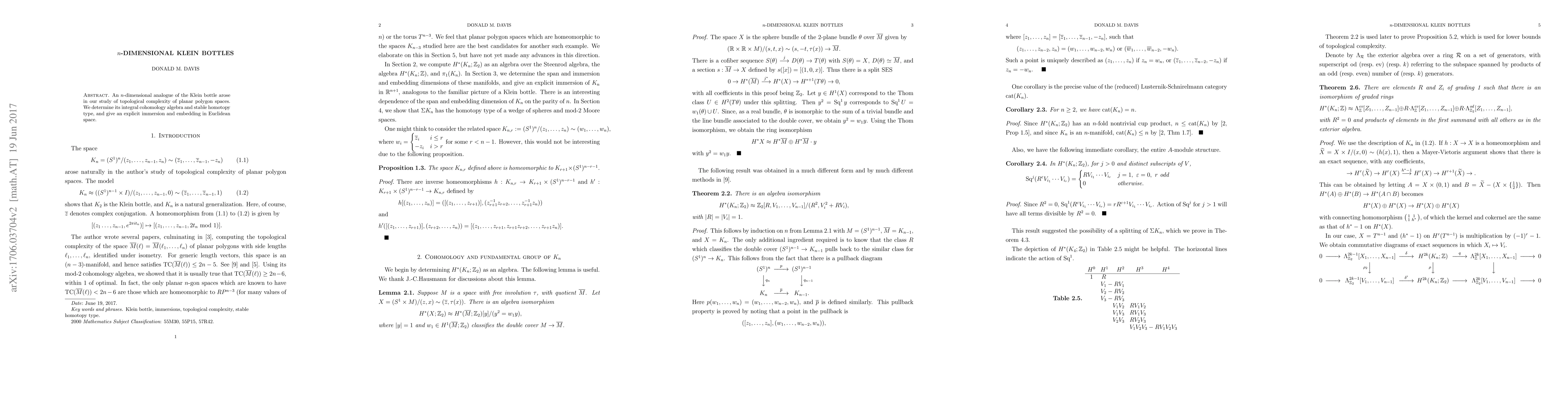 An n-dimensional analogue of the Klein bottle arose in our study of topological complexity of planar polygon spaces. We determine its integral cohomology algebra and stable homotopy type, and give an explicit immersion and embedding in Euclidean space.