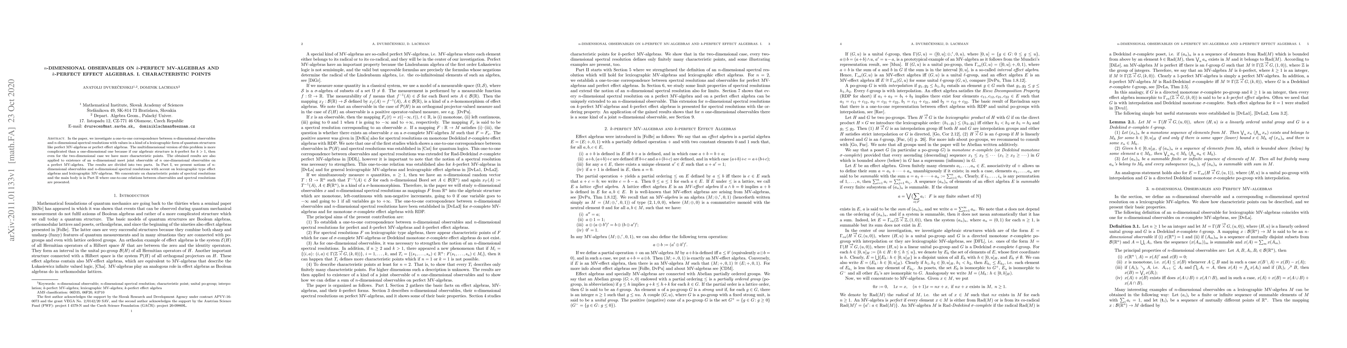 In the paper, we investigate a one-to-one correspondence between $n$-dimensional observables and $n$-dimensional spectral resolutions with values in a kind of a lexicographic form of quantum structures like perfect MV-algebras or perfect effect algebras. The multidimensional version of this problem is more complicated than a one-dimensional one because if our algebraic structure is $k$-perfect for $k>1$, then even for the two-dimensional case we have more characteristic points. The obtained results are also applied to existence of an $n$-dimensional meet joint observable of $n$ one-dimensional observables on a perfect MV-algebra. The results are divided into two parts. In Part I, we present notions of $n$-dimensional observables and $n$-dimensional spectral resolutions with accent on lexicographic type effect algebras and lexicographic MV-algebras. We concentrate on characteristic points of spectral resolutions and the main body is in Part II where one-to-one relations between observables and spectral resolutions are presented.