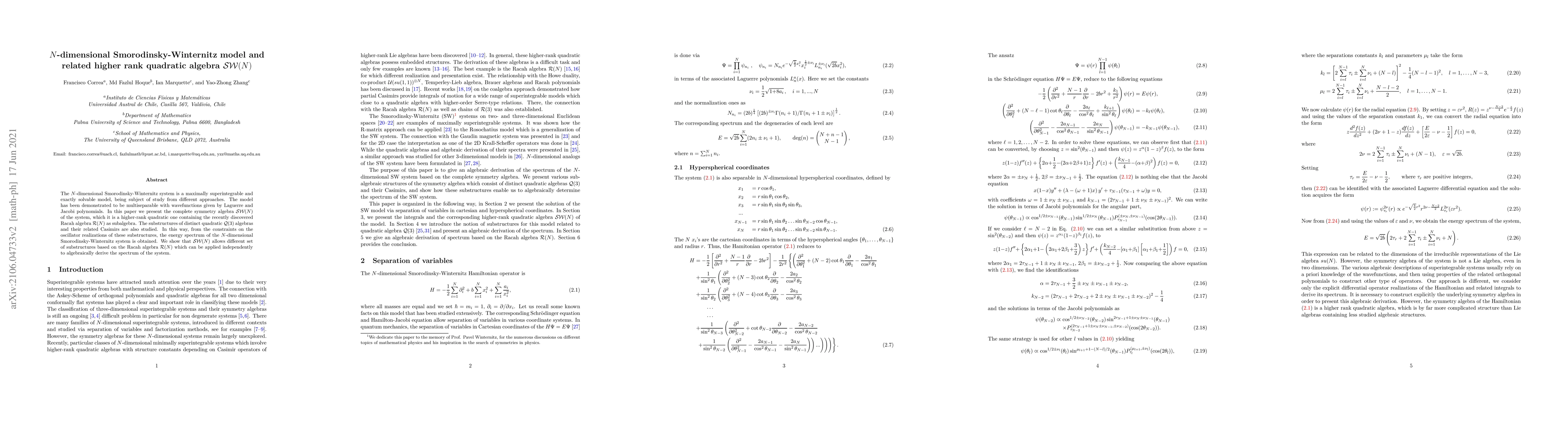 This paper presents the complete symmetry algebra ${\cal SW}(N)$ of the maximally superintegrable $N$-dimensional Smorodinsky-Winternitz system, revealing it as a higher-rank quadratic algebra containing the Racah algebra ${\cal R}(N)$ as a subalgebra. The study of distinct quadratic ${\cal Q}(3)$ substructures and their Casimirs leads to the derivation of the system's energy spectrum.