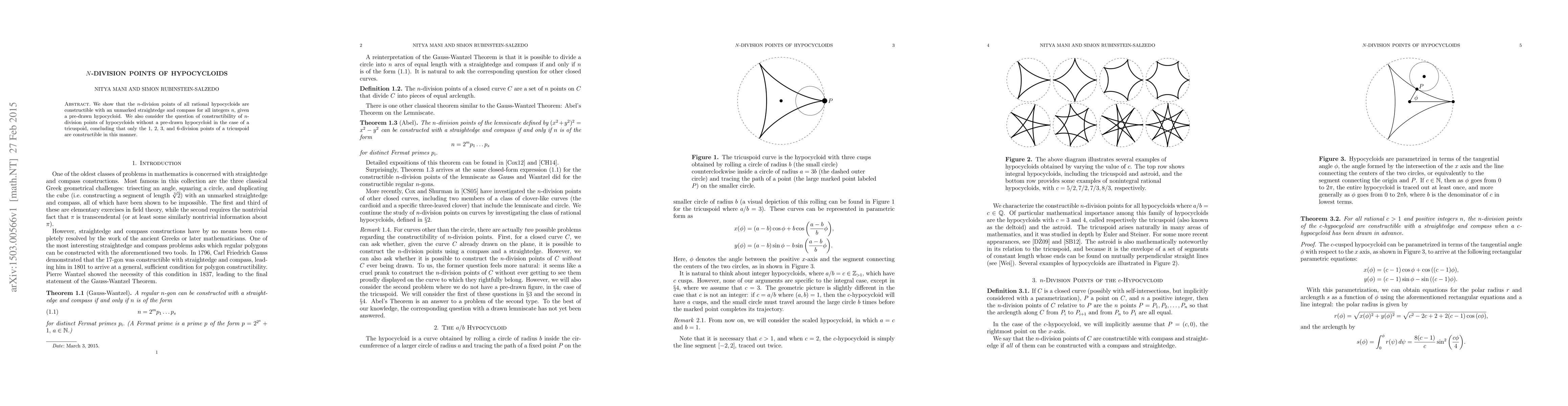This paper demonstrates that $n$-division points of rational hypocycloids can be constructed using only an unmarked straightedge and compass, provided the hypocycloid is pre-drawn. For tricuspoids, only the $1$, $2$, $3$, and $6$-division points can be constructed without a pre-drawn figure.