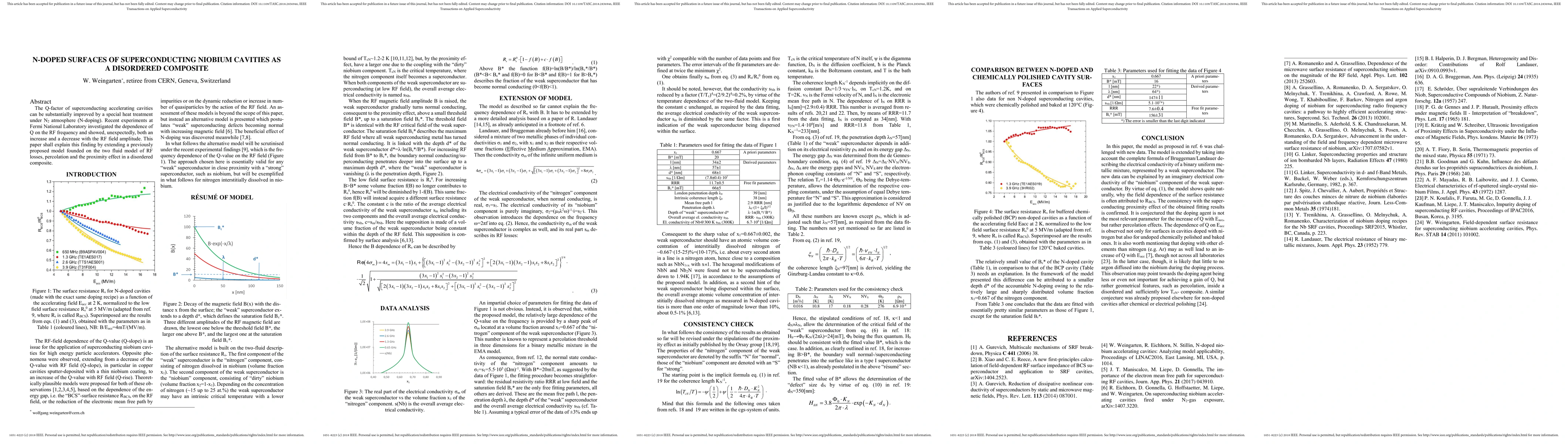 This paper investigates N-doped niobium cavities' Q-factor improvements via heat treatment under N2 atmosphere, explaining unexpected frequency and RF field amplitude dependencies using an extended model based on RF losses, percolation, and proximity effects in disordered composites.
