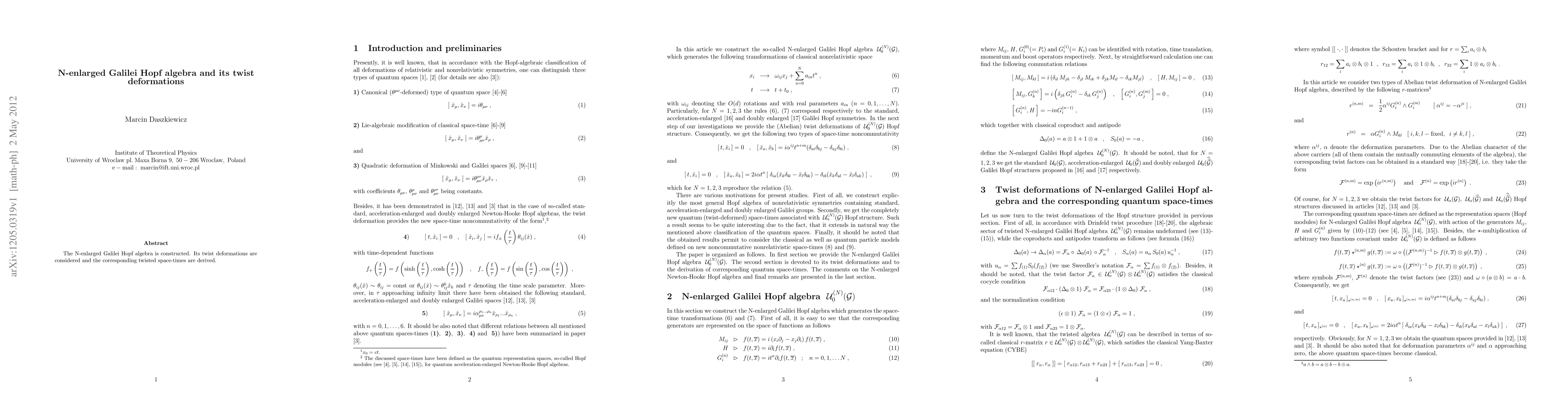Summary: This paper constructs the N-enlarged Galilei Hopf algebra and explores its twist deformations, leading to the derivation of corresponding twisted space-time models.