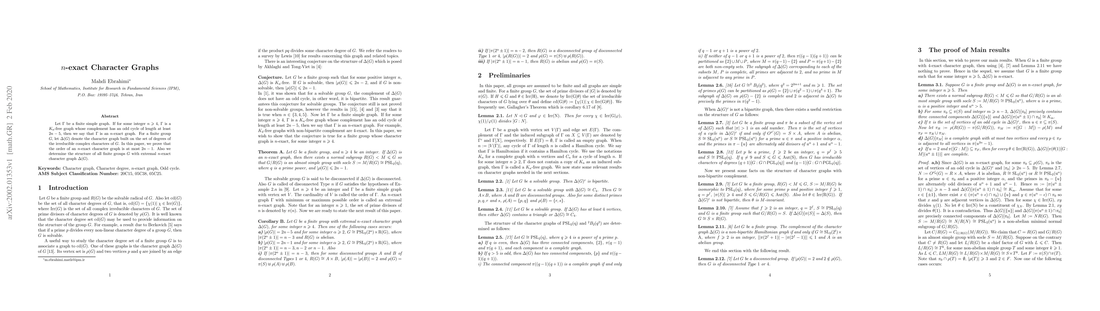 Let $\Gamma$ be a finite simple graph. If for some integer $n\geqslant 4$, $\Gamma$ is a $K_n$-free graph whose complement has an odd cycle of length at least $2n-5$, then we say that $\Gamma$ is an $n$-exact graph. For a finite group $G$, let $\Delta(G)$ denote the character graph built on the set of degrees of the irreducible complex characters of $G$. In this paper, we prove that the order of an $n$-exact character graph is at most $2n-1$. Also we determine the structure of all finite groups $G$ with extremal $n$-exact character graph $\Delta(G)$.