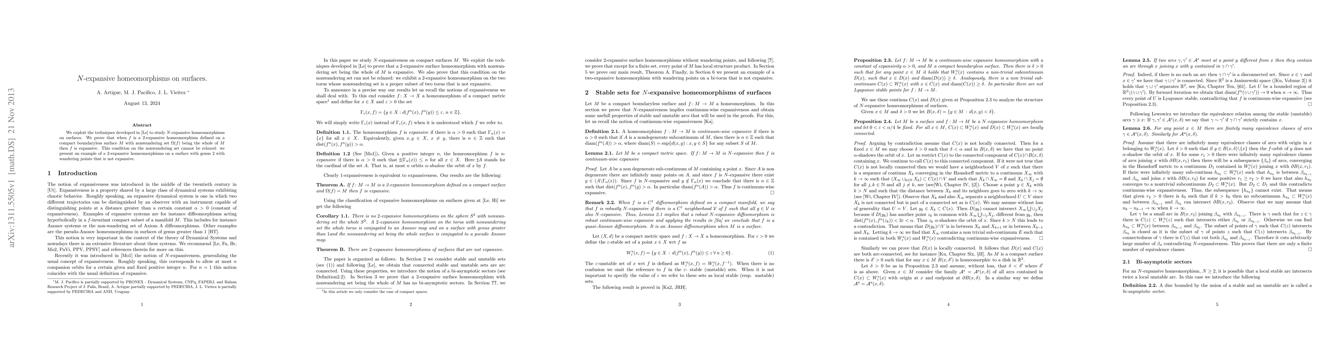 This paper investigates N-expansive homeomorphisms on surfaces, proving that a 2-expansive homeomorphism on a compact boundaryless surface without wandering points is expansive. It also demonstrates that the absence of wandering points is crucial, as an example of a 2-expansive homeomorphism on a bitorus with wandering points fails to be expansive.