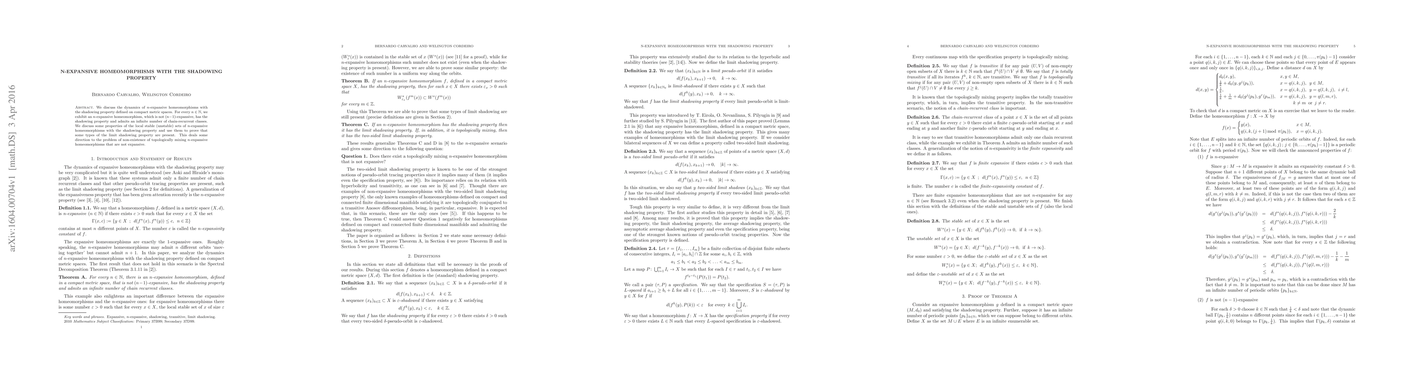 The paper discusses the dynamics of n-expansive homeomorphisms with the shadowing property on compact metric spaces, constructing examples to illustrate properties and proving theorems related to local stable and unstable sets.
