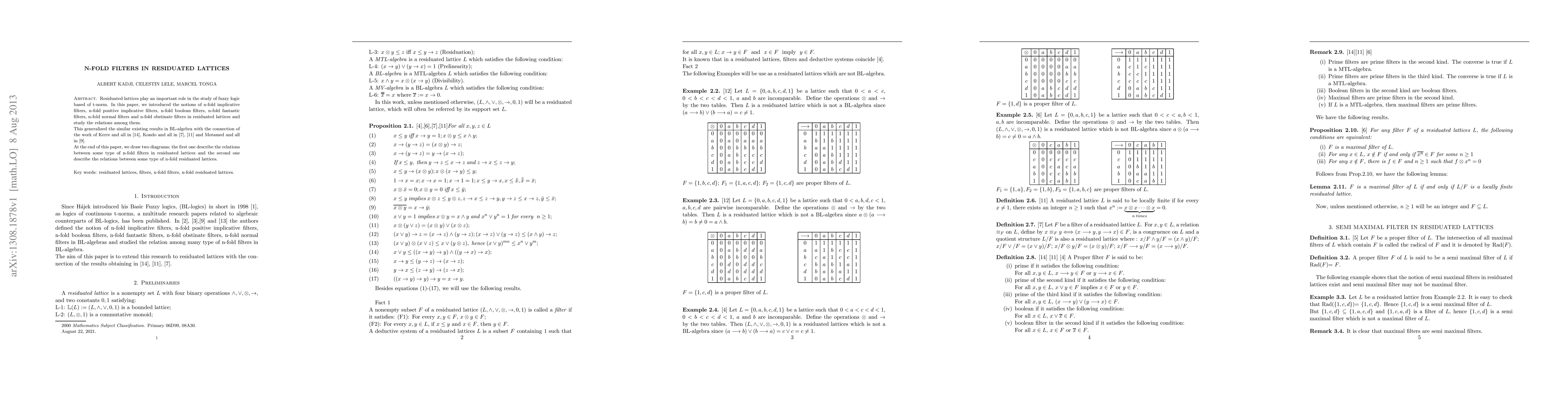 Residuated lattices play an important role in the study of fuzzy logic based of t-norm. In this paper, we introduced the notions of n-fold implicative filters, n-fold positive implicative filters, n-fold boolean filters, n-fold fantastic filters, n-fold normal filters and n-fold obstinate filters in residuated lattices and study the relations among them. This generalized the similar existing results in BL-algebra with the connection of the work of Kerre and all in [14], Kondo and all in [7], [11] and Motamed and all in [9]. At the end of this paper, we draw two diagrams; the first one describe the relations between some type of n-fold filters in residuated lattices and the second one describe the relations between some type of n-fold residuated lattices.