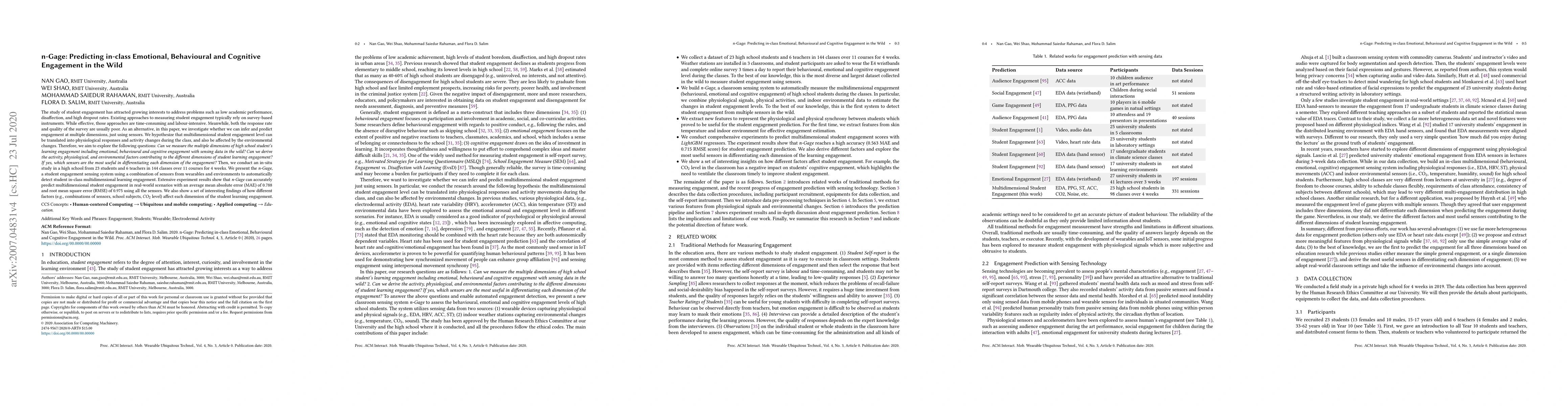 This paper explores predicting multidimensional student engagement (emotional, behavioral, cognitive) in high school using sensor data instead of traditional surveys. The n-Gage system, combining wearable and environmental sensors, accurately predicts engagement in real-world settings, revealing insights into how different factors influence various engagement dimensions.