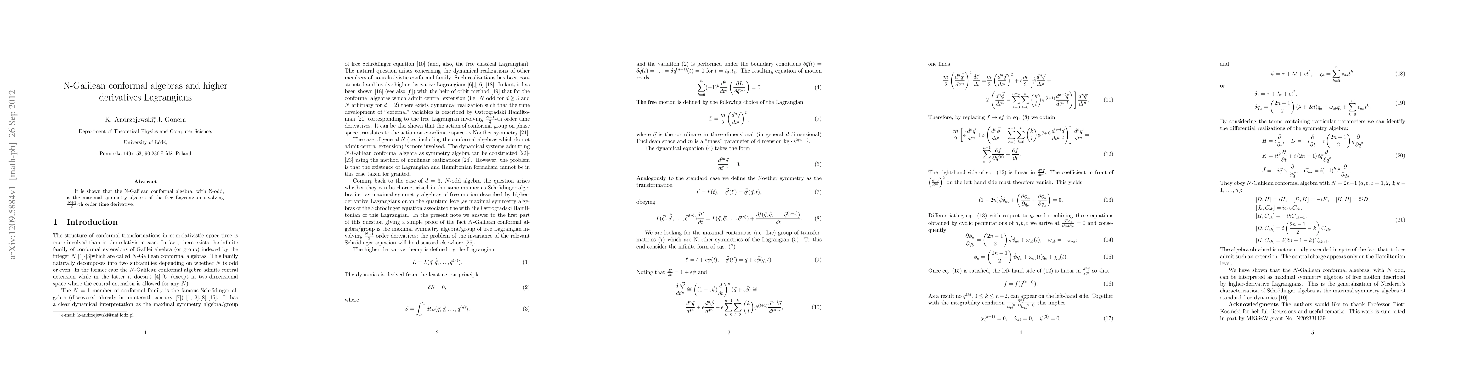 Summary: The paper demonstrates that the N-Galilean conformal algebra, when N is odd, serves as the maximal symmetry algebra for a free Lagrangian that incorporates (N+1)/2-th order time derivatives. This establishes a connection between conformal algebra and higher-derivative Lagrangians.