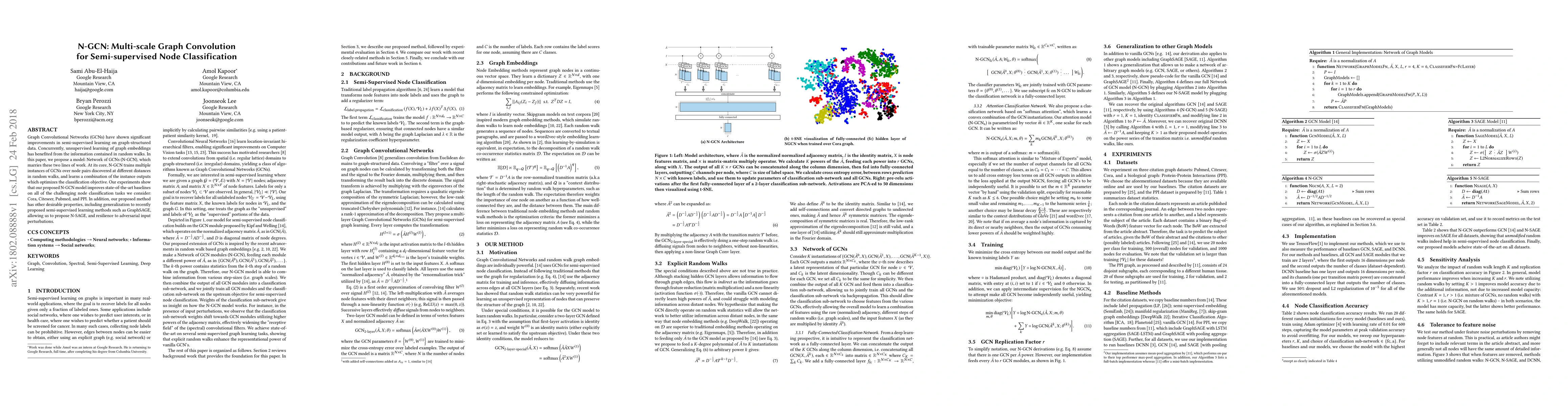 The paper introduces N-GCN, a multi-scale Graph Convolutional Network that leverages random walks to train multiple GCN instances over nodes at varying distances, combining their outputs for improved semi-supervised node classification. The proposed method outperforms state-of-the-art baselines on several datasets and is also generalizable and resilient to adversarial attacks.