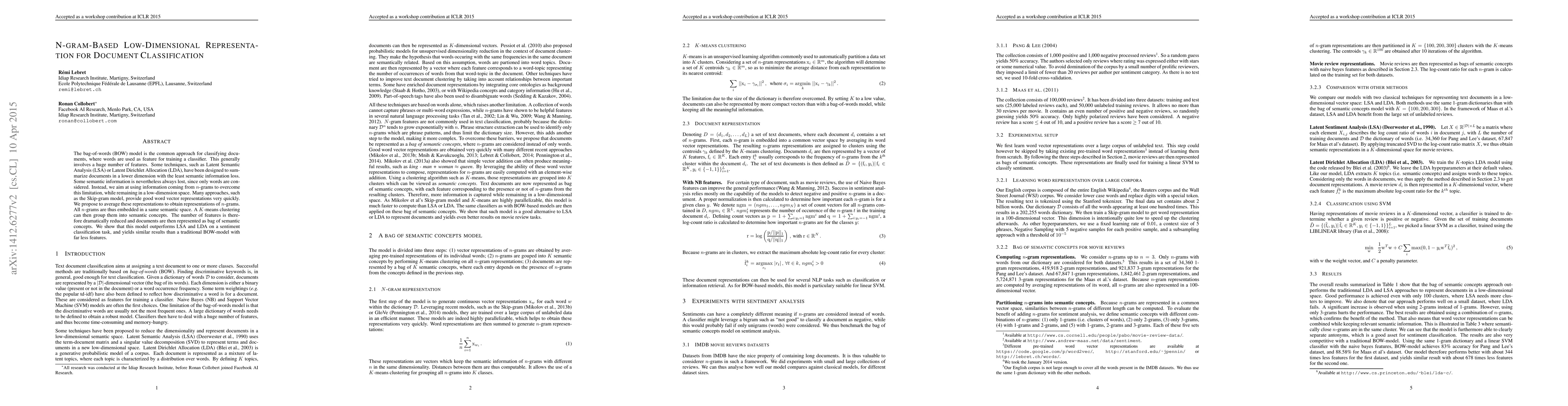 The bag-of-words (BOW) model is the common approach for classifying documents, where words are used as feature for training a classifier. This generally involves a huge number of features. Some techniques, such as Latent Semantic Analysis (LSA) or Latent Dirichlet Allocation (LDA), have been designed to summarize documents in a lower dimension with the least semantic information loss. Some semantic information is nevertheless always lost, since only words are considered. Instead, we aim at using information coming from n-grams to overcome this limitation, while remaining in a low-dimension space. Many approaches, such as the Skip-gram model, provide good word vector representations very quickly. We propose to average these representations to obtain representations of n-grams. All n-grams are thus embedded in a same semantic space. A K-means clustering can then group them into semantic concepts. The number of features is therefore dramatically reduced and documents can be represented as bag of semantic concepts. We show that this model outperforms LSA and LDA on a sentiment classification task, and yields similar results than a traditional BOW-model with far less features.