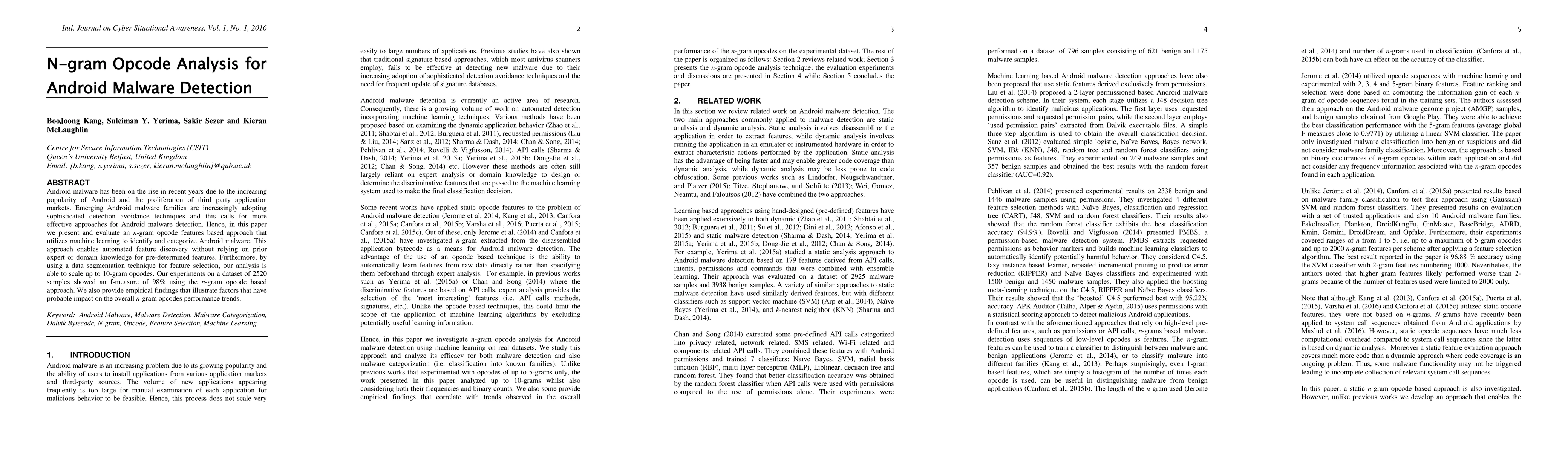 This paper proposes an n-gram opcode analysis method for detecting Android malware using machine learning, achieving an f-measure of 98% on a dataset of 2520 samples. The approach leverages automated feature discovery and scales up to 10-gram opcodes through data segmentation.