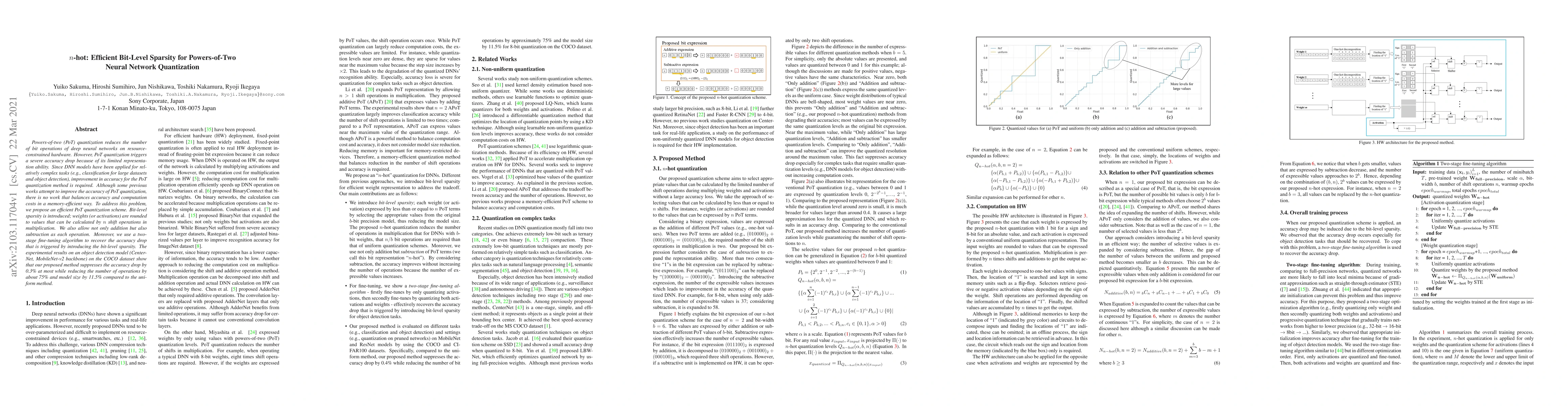 The paper proposes an efficient bit-level sparsity method for powers-of-two neural network quantization, introducing n-hot representation to balance accuracy and computation costs. The method achieves up to 75% reduction in operations and 11.5% in model size with minimal accuracy drop (0.3%) on an object detection model.