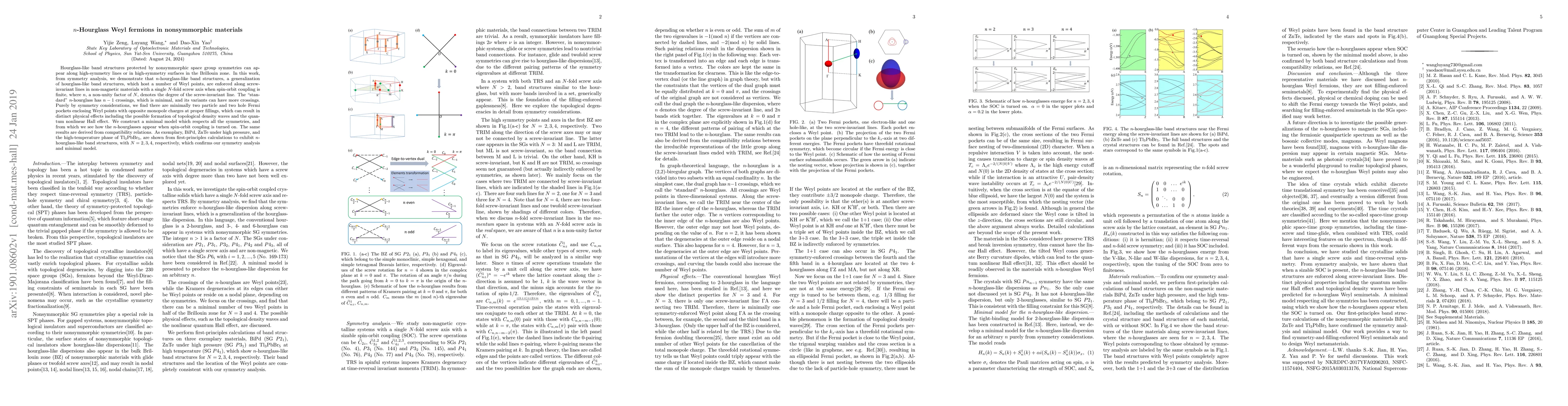 This paper explores $n$-hourglass-like band structures in nonsymmorphic materials, demonstrating that these structures host Weyl points along screw-invariant lines. The study reveals the presence of two particle and two hole Fermi pockets, predicting potential topological phenomena such as density waves and the quantum nonlinear Hall effect, confirmed by first-principles calculations on BiPd, ZnTe, and Tl$_3$PbBr$_5$.