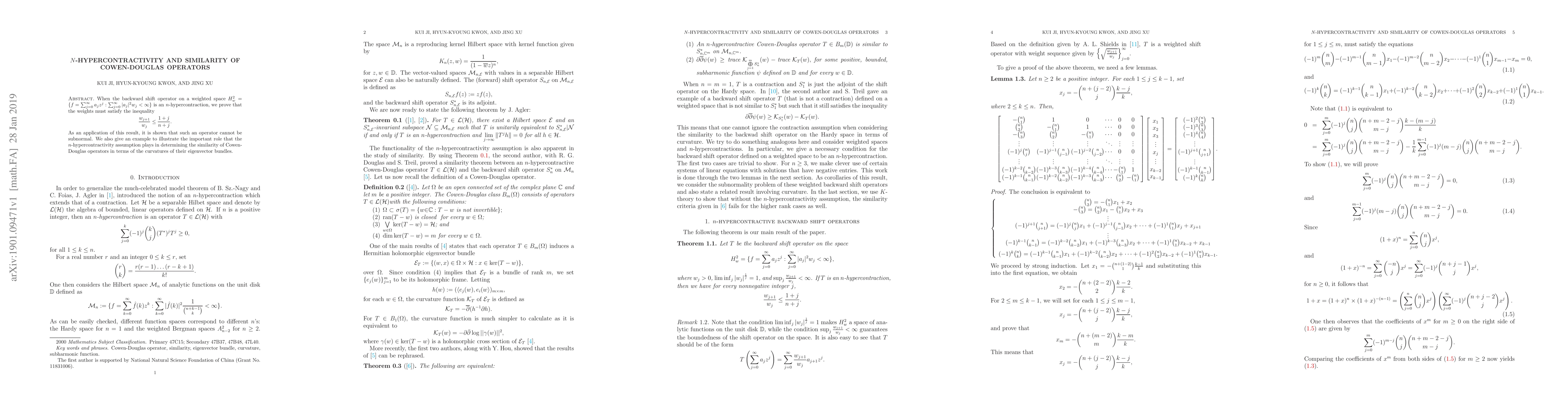 When the backward shift operator on a weighted space $H^2_w=\{f=\sum_{j=0} ^{\infty} a_jz^j : \sum_{j=0}^{\infty} |a_j|^2w_j < \infty\}$ is an $n$-hypercontraction, we prove that the weights must satisfy the inequality $$\frac{w_{j+1}}{w_j} \leq {\frac{1+j}{n+j}}.$$ As an application of this result, it is shown that such an operator cannot be subnormal. We also give an example to illustrate the important role that the $n$-hypercontractivity assumption plays in determining the similarity of Cowen-Douglas operators in terms of the curvatures of their eigenvector bundles.