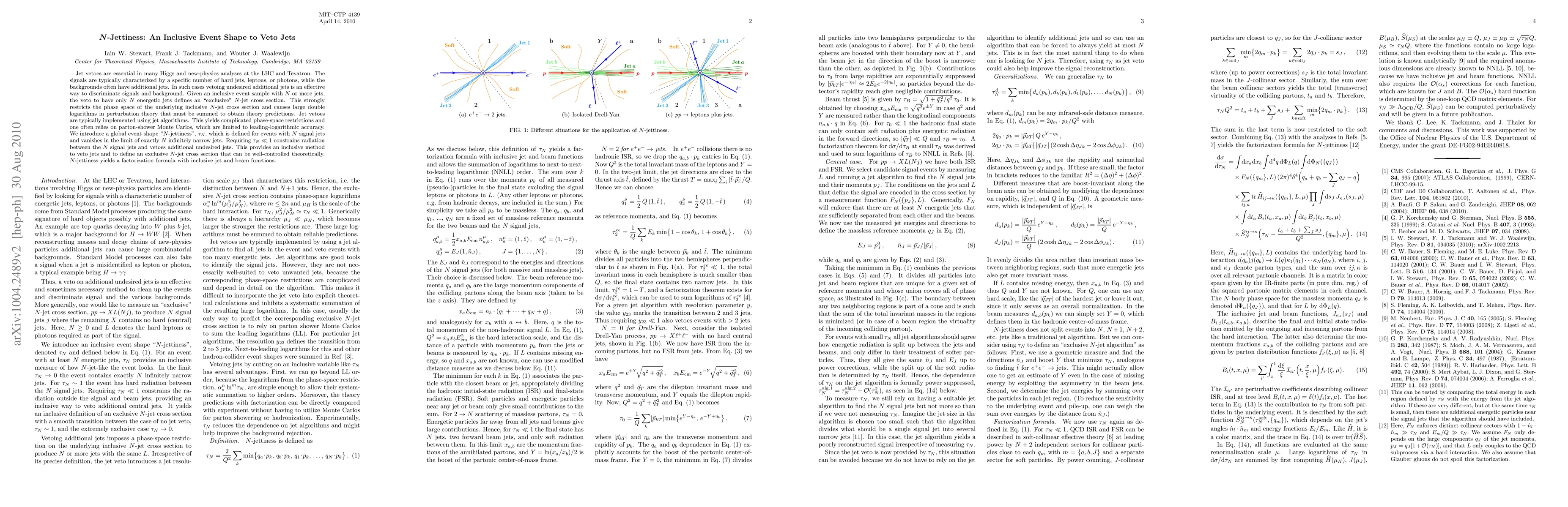 The research introduces N-jettiness, an inclusive event shape defined for events with N signal jets, which vanishes in the limit of exactly N infinitely narrow jets. It requires tau_N << 1 to constrain radiation between the N signal jets and veto additional undesired jets, providing an inclusive method to veto jets and define an exclusive N-jet cross section that can be theoretically controlled.