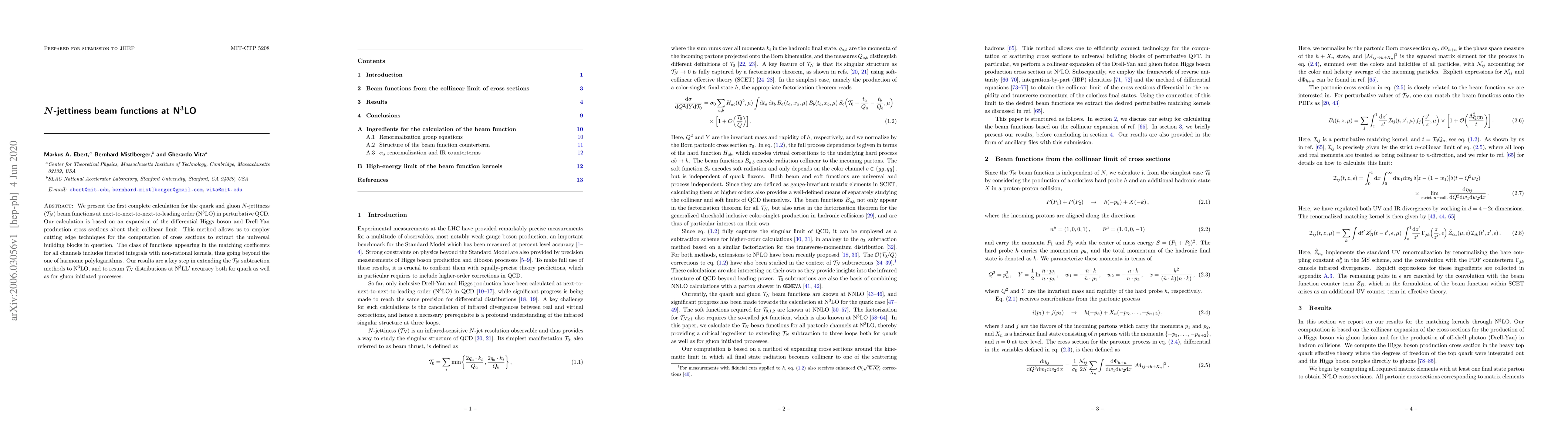 We present the first complete calculation for the quark and gluon $N$-jettiness ($\Tau_N$) beam functions at next-to-next-to-next-to-leading order (N$^3$LO) in perturbative QCD. Our calculation is based on an expansion of the differential Higgs boson and Drell-Yan production cross sections about their collinear limit. This method allows us to employ cutting edge techniques for the computation of cross sections to extract the universal building blocks in question. The class of functions appearing in the matching coefficents for all channels includes iterated integrals with non-rational kernels, thus going beyond the one of harmonic polylogarithms. Our results are a key step in extending the $\Tau_N$ subtraction methods to N$^3$LO, and to resum $\Tau_N$ distributions at N$^3$LL$^\prime$ accuracy both for quark as well as for gluon initiated processes.