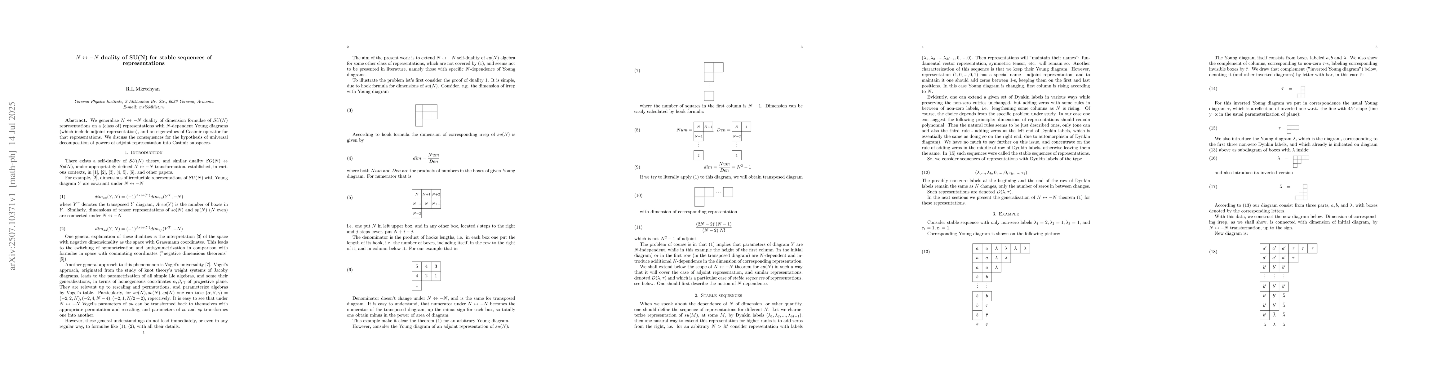 We generalize $N \leftrightarrow -N$ duality of dimension formulae of $SU(N)$ representations on a (class of) representations with $N$-dependent Young diagrams (which include the adjoint representation), and on eigenvalues of the Casimir operator for those representations. We discuss the consequences for the hypothesis of universal decomposition of powers of the adjoint representation into Casimir subspaces.