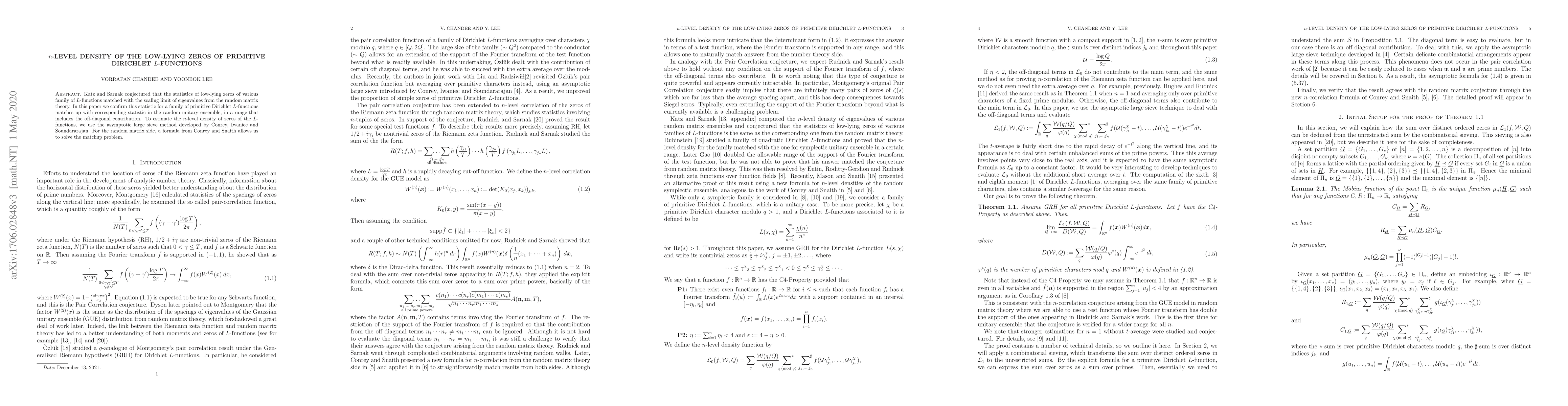 Katz and Sarnak conjectured that the statistics of low-lying zeros of various family of $L$-functions matched with the scaling limit of eigenvalues from the random matrix theory. In this paper we confirm this statistic for a family of primitive Dirichlet $L$-functions matches up with corresponding statistic in the random unitary ensemble, in a range that includes the off-diagonal contribution. To estimate the $n$-level density of zeros of the $L$-functions, we use the asymptotic large sieve method developed by Conrey, Iwaniec and Soundararajan. For the random matrix side, a formula from Conrey and Snaith allows us to solve the matchup problem.