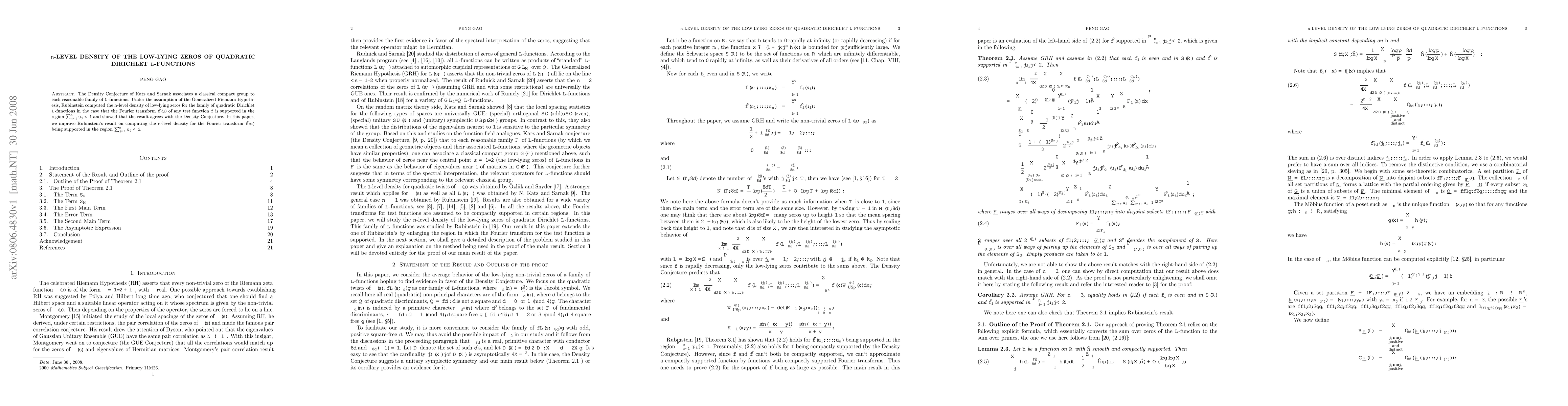 This paper refines Rubinstein's computation of the $n$-level density of low-lying zeros for quadratic Dirichlet $L$-functions, extending the Fourier support region from $\sum^n_{j=1}u_j < 1$ to $\sum^n_{j=1}u_j < 2$, and confirms the Density Conjecture under the Generalized Riemann Hypothesis.