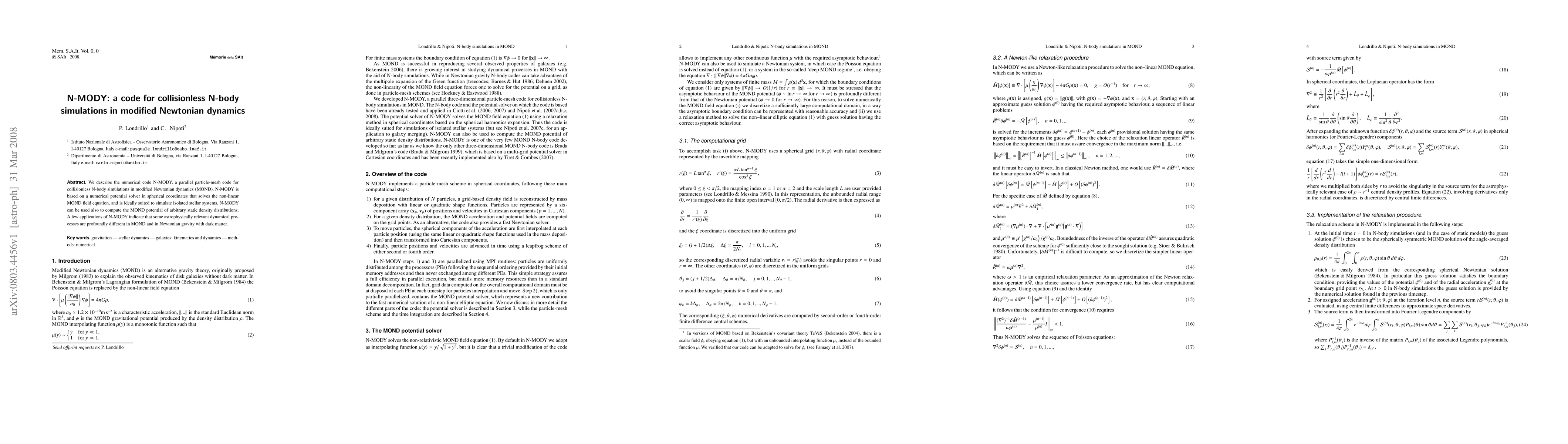 N-MODY is a parallel particle-mesh code for simulating collisionless N-body systems in modified Newtonian dynamics (MOND). It employs a numerical potential solver in spherical coordinates to solve the MOND field equation, offering insights into the differences between MOND and Newtonian gravity in astrophysical processes.