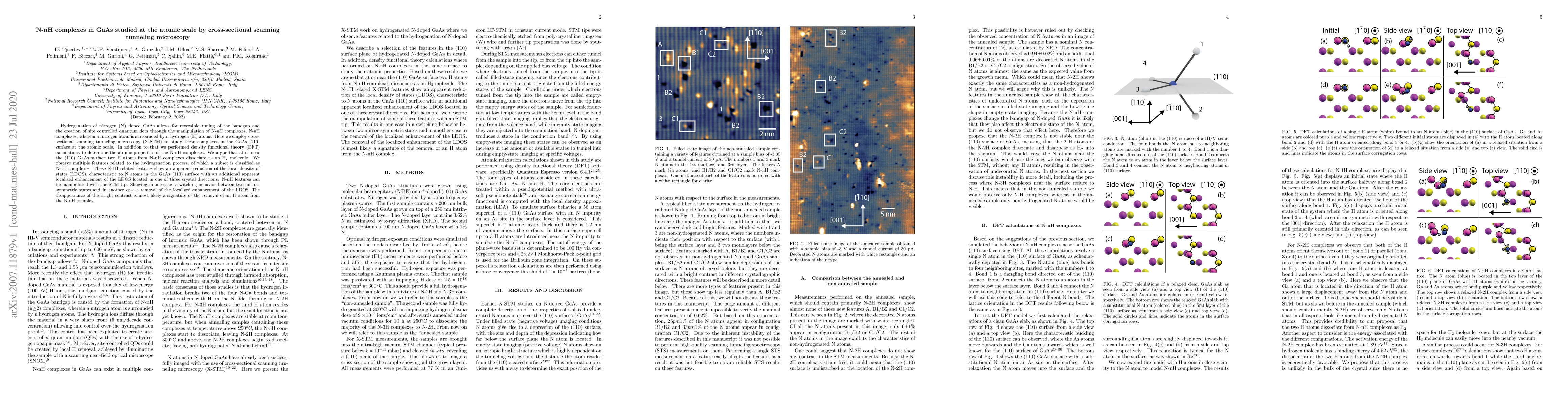 Hydrogenation of nitrogen (N) doped GaAs allows for reversible tuning of the bandgap and the creation of site controlled quantum dots through the manipulation of N-nH complexes, N-nH complexes, wherein a nitrogen atom is surrounded by n hydrogen (H) atoms. Here we employ cross-sectional scanning tunneling microscopy (X-STM) to study these complexes in the GaAs (110) surface at the atomic scale. In addition to that we performed density functional theory (DFT) calculations to determine the atomic properties of the N-nH complexes. We argue that at or near the (110) GaAs surface two H atoms from N-nH complexes dissociate as an H$_2$ molecule. We observe multiple features related to the hydrogenation process, of which a subset is classified as N-1H complexes. These N-1H related features show an apparent reduction of the local density of states (LDOS), characteristic to N atoms in the GaAs (110) surface with an additional apparent localized enhancement of the LDOS located in one of three crystal directions. N-nH features can be manipulated with the STM tip. Showing in one case a switching behavior between two mirror-symmetric states and in another case a removal of the localized enhancement of the LDOS. The disappearance of the bright contrast is most likely a signature of the removal of an H atom from the N-nH complex.