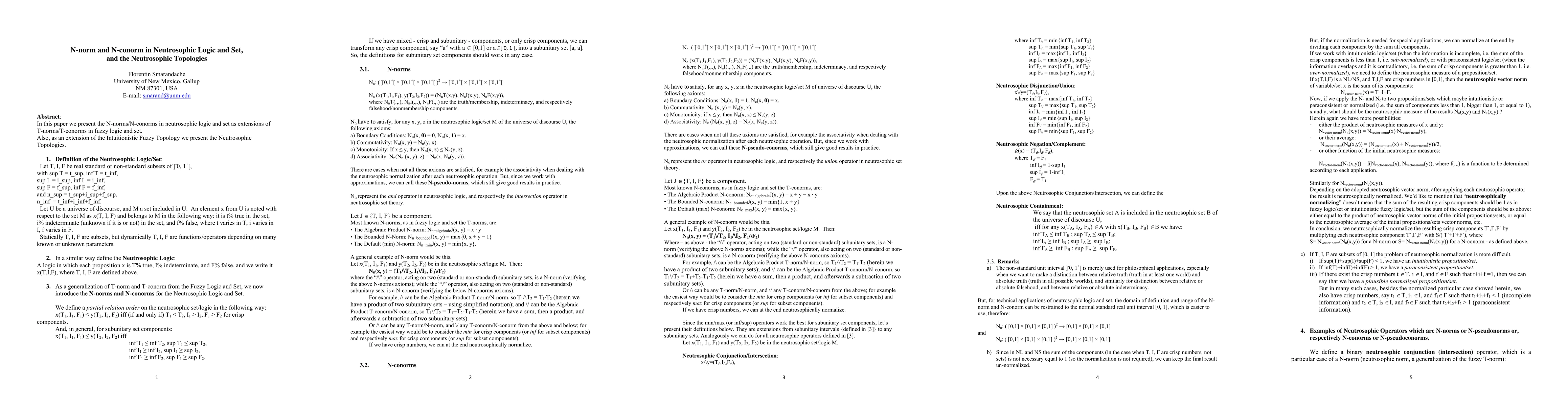 In this paper we present the N-norms/N-conorms in neutrosophic logic and set as extensions of T-norms/T-conorms in fuzzy logic and set. Also, as an extension of the Intuitionistic Fuzzy Topology we present the Neutrosophic Topologies.