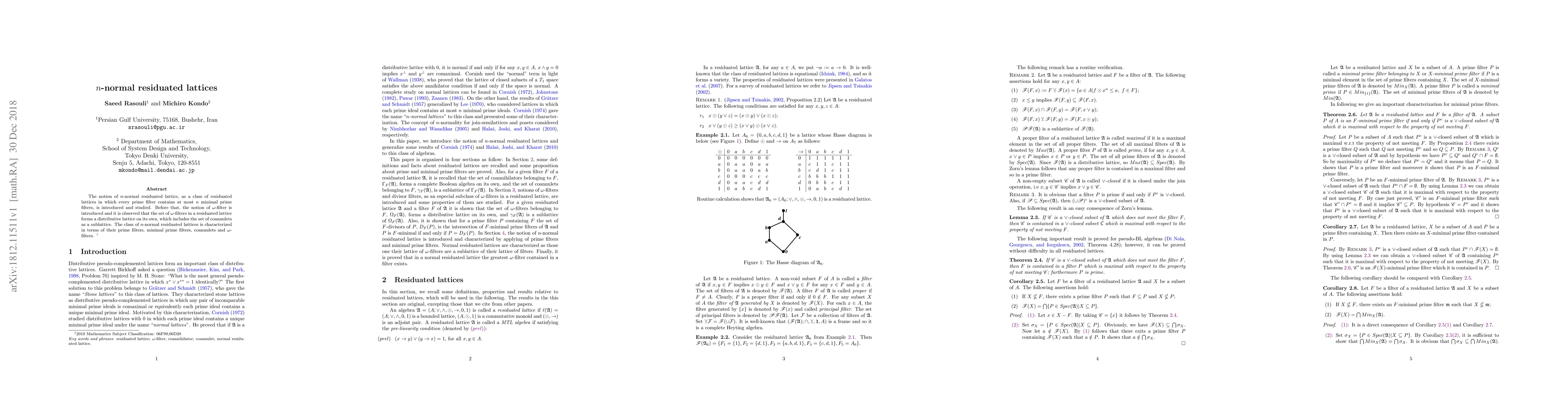 The paper introduces $n$-normal residuated lattices, which are characterized by a limit on the number of minimal prime filters in each prime filter, and explores their connection to $ heta$-filters and distributive structures.